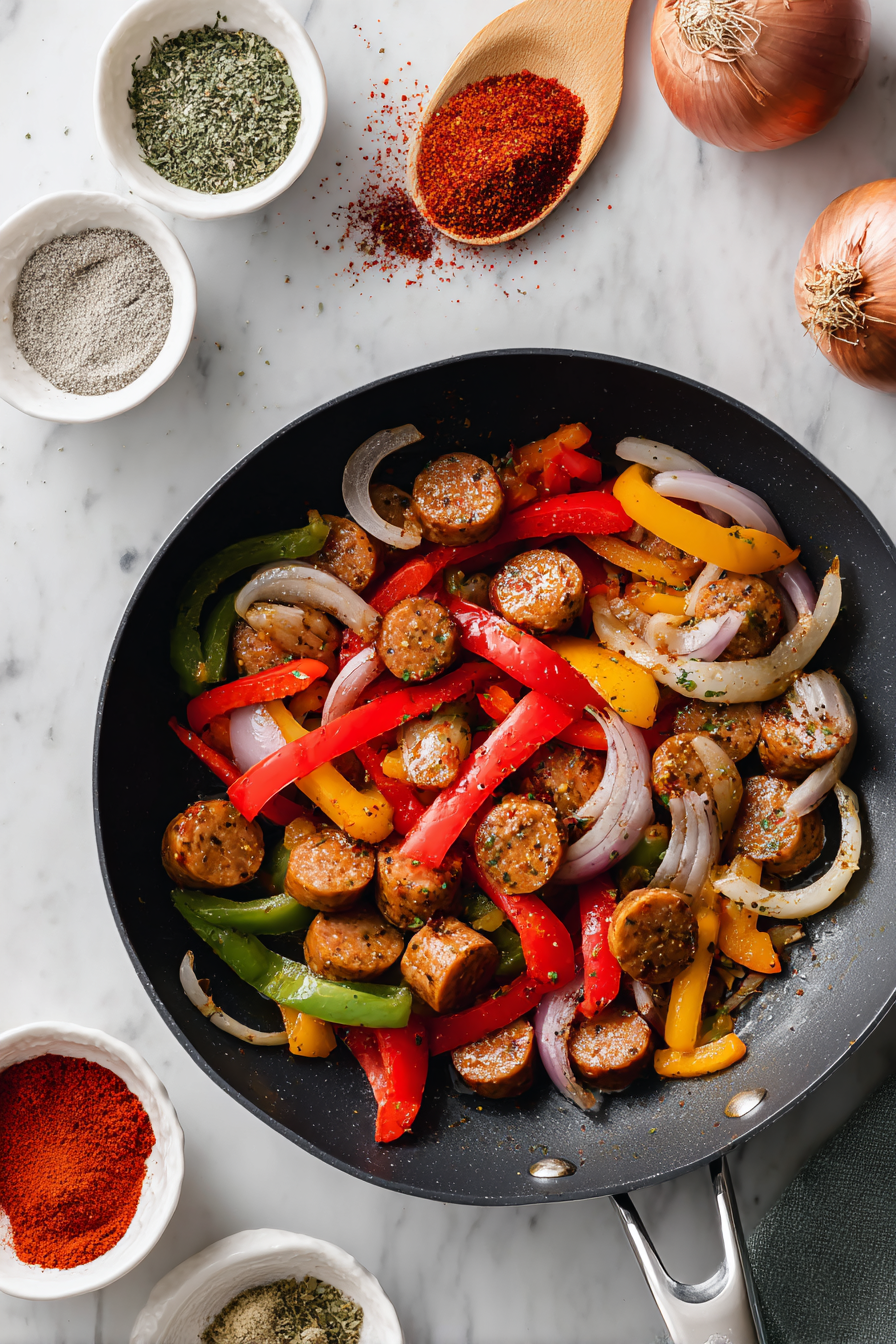 Cook turkey sausage, onion, and bell pepper in skillet until sausage is cooked and veggies are soft.