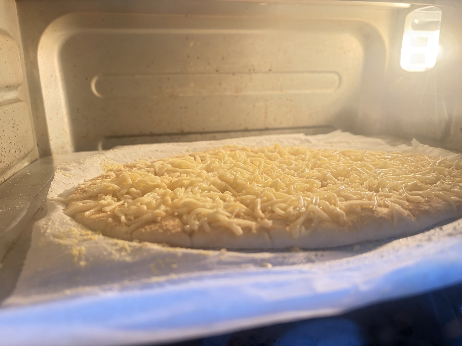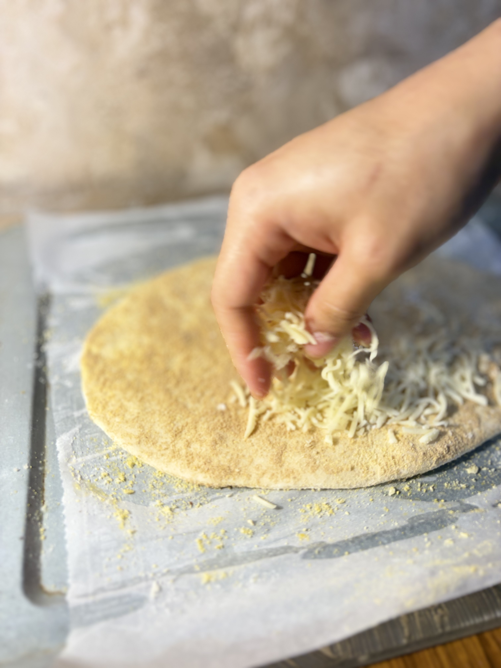 - Sprinkle mozzarella cheese evenly over the dough, followed by parmesan, garlic salt, and dried oregano.