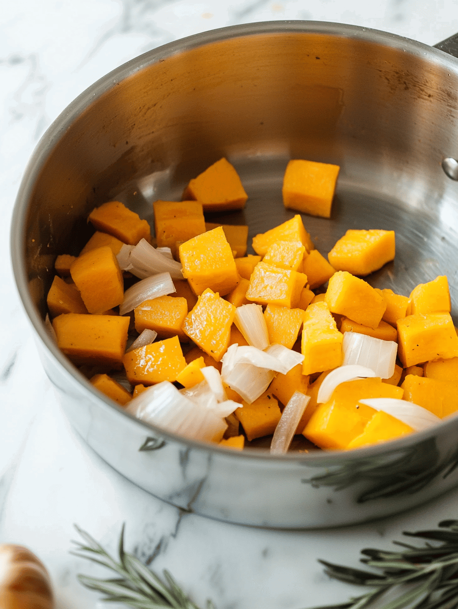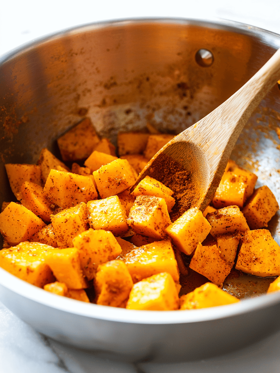 • Add the cubed pumpkin to the pot and stir well to coat with the spices. Cook for 5 minutes, allowing the pumpkin to start softening and absorbing flavors.