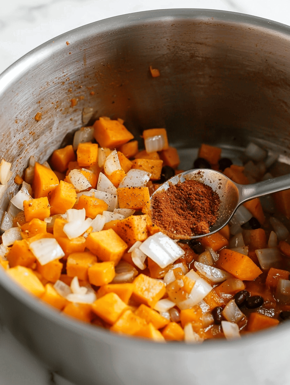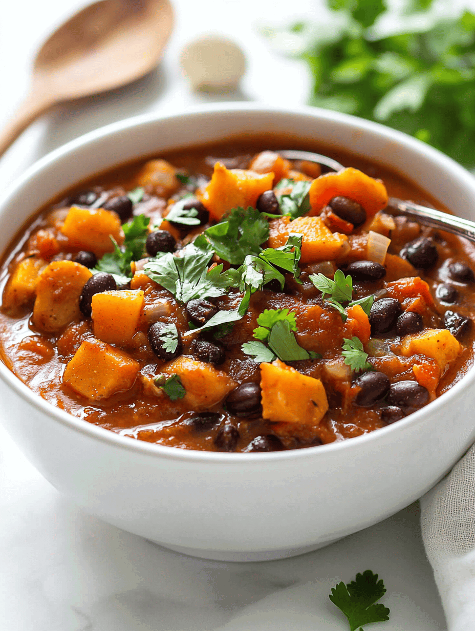 This pumpkin black bean chili combines hearty chunks of pumpkin with tender black beans, simmered in a spiced tomato base. The dish has a thick, velvety texture and a warm, comforting appearance with a vibrant orange hue from the pumpkin and dark beans throughout.