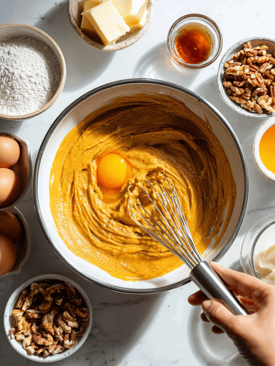 - Add the eggs one at a time, beating well after each addition. Then stir in the pumpkin puree and vanilla extract until the mixture is smooth and glossy.