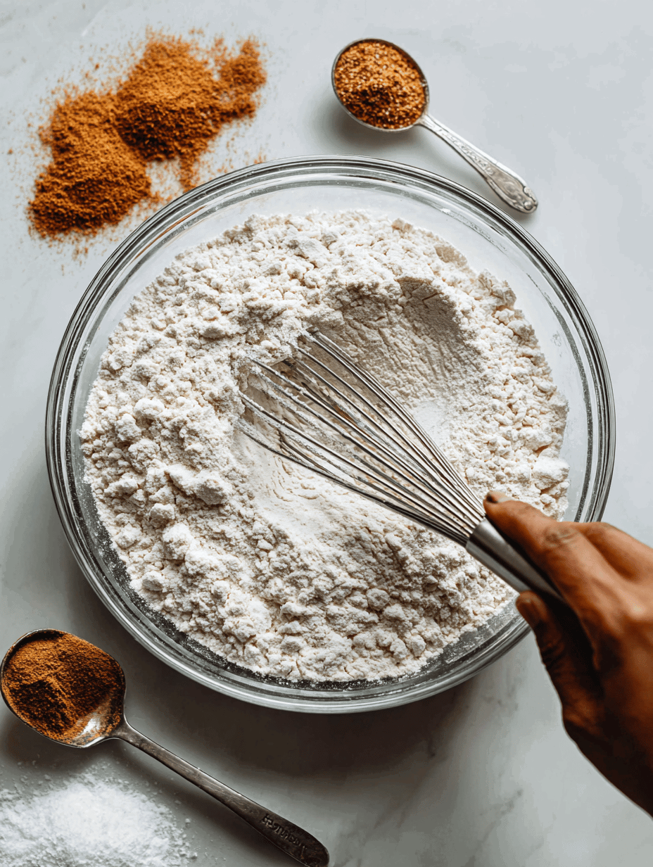 - In a separate bowl, whisk together the flour, cinnamon, nutmeg, baking soda, and salt to evenly distribute the spices and leavening agents.