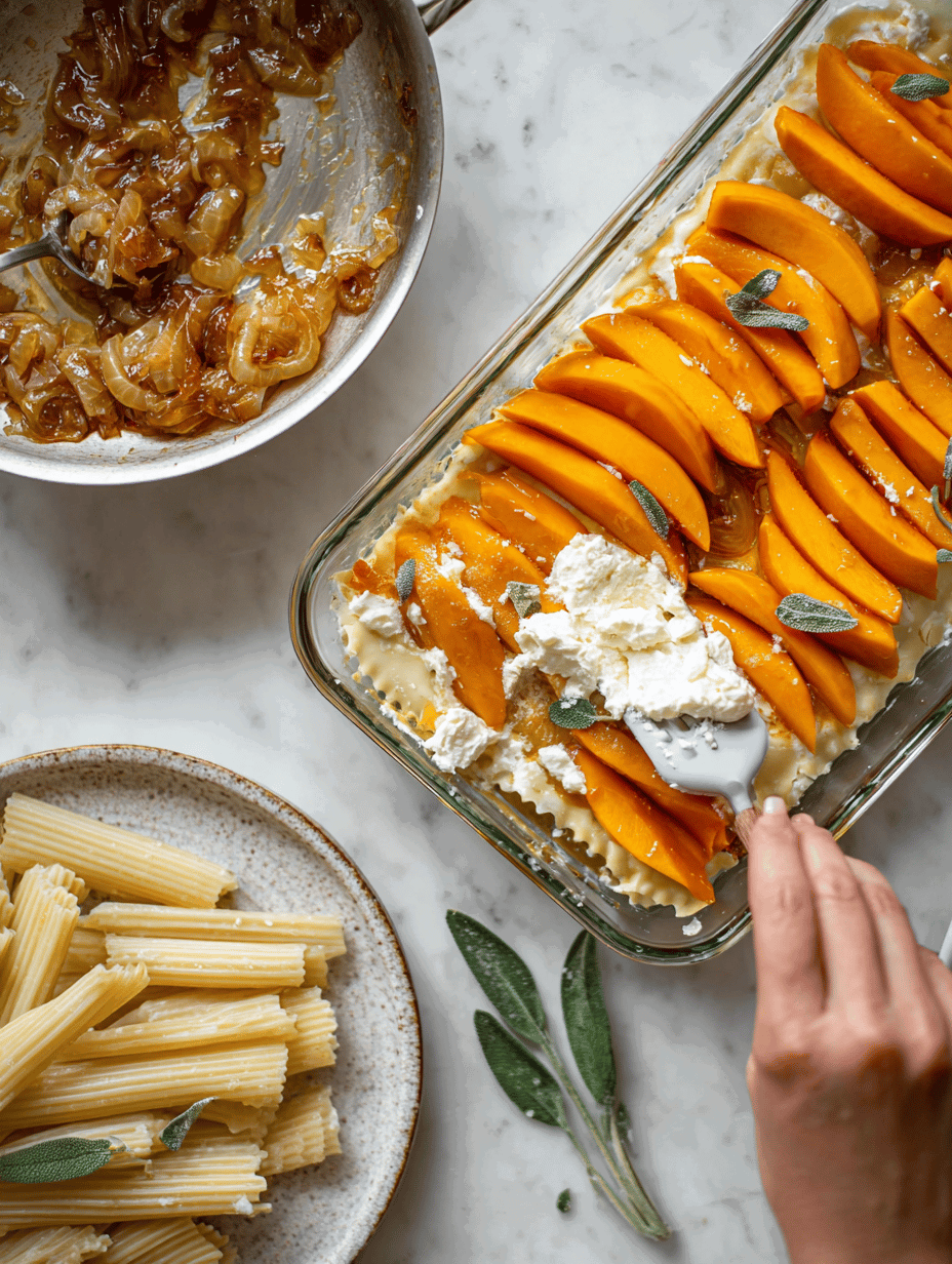 • In a bowl, mix the ricotta cheese with chopped sage, a pinch of salt, and pepper. This creamy mixture will layer beautifully with the pumpkin and noodles.