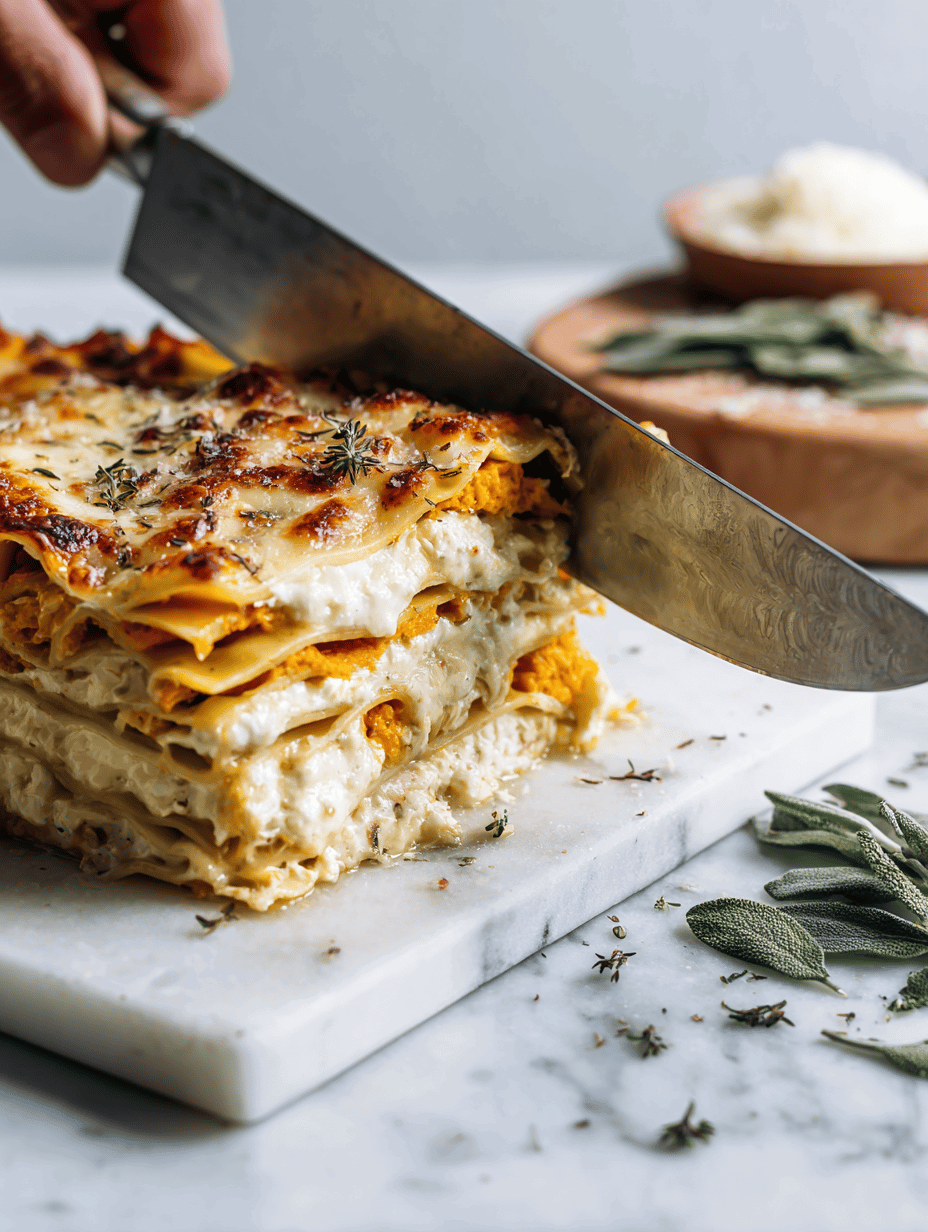 • Once baked, let the lasagna rest for at least 10 minutes. This helps it set and makes slicing easier. Slice into squares and serve warm, enjoying the layers of tender pumpkin, cheesy goodness, and savory herbs.