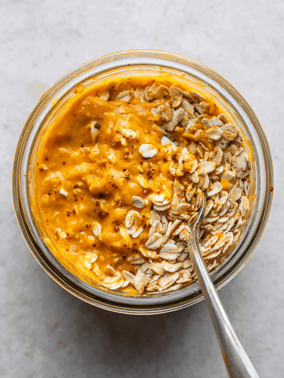 - Mix the rolled oats, pumpkin purée, cinnamon, nutmeg, and ginger in your jar until well combined. You should see flecks of spice and a vibrant orange hue.