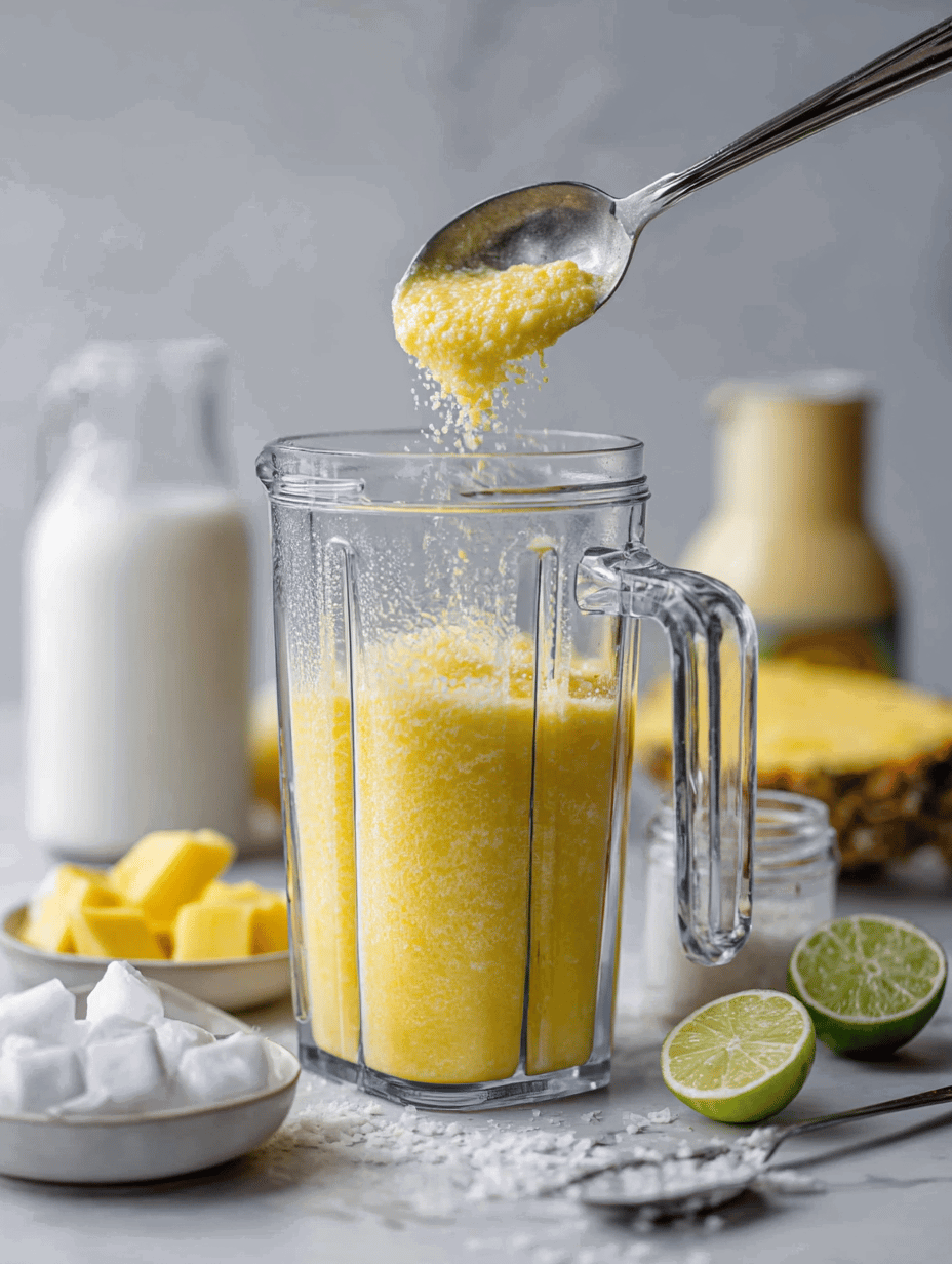 • Check the texture — it should be creamy, with tiny ice crystals and a vibrant yellow color. If too watery, add a few more ice cubes and blend again; if too thick, pour in a splash more coconut milk.