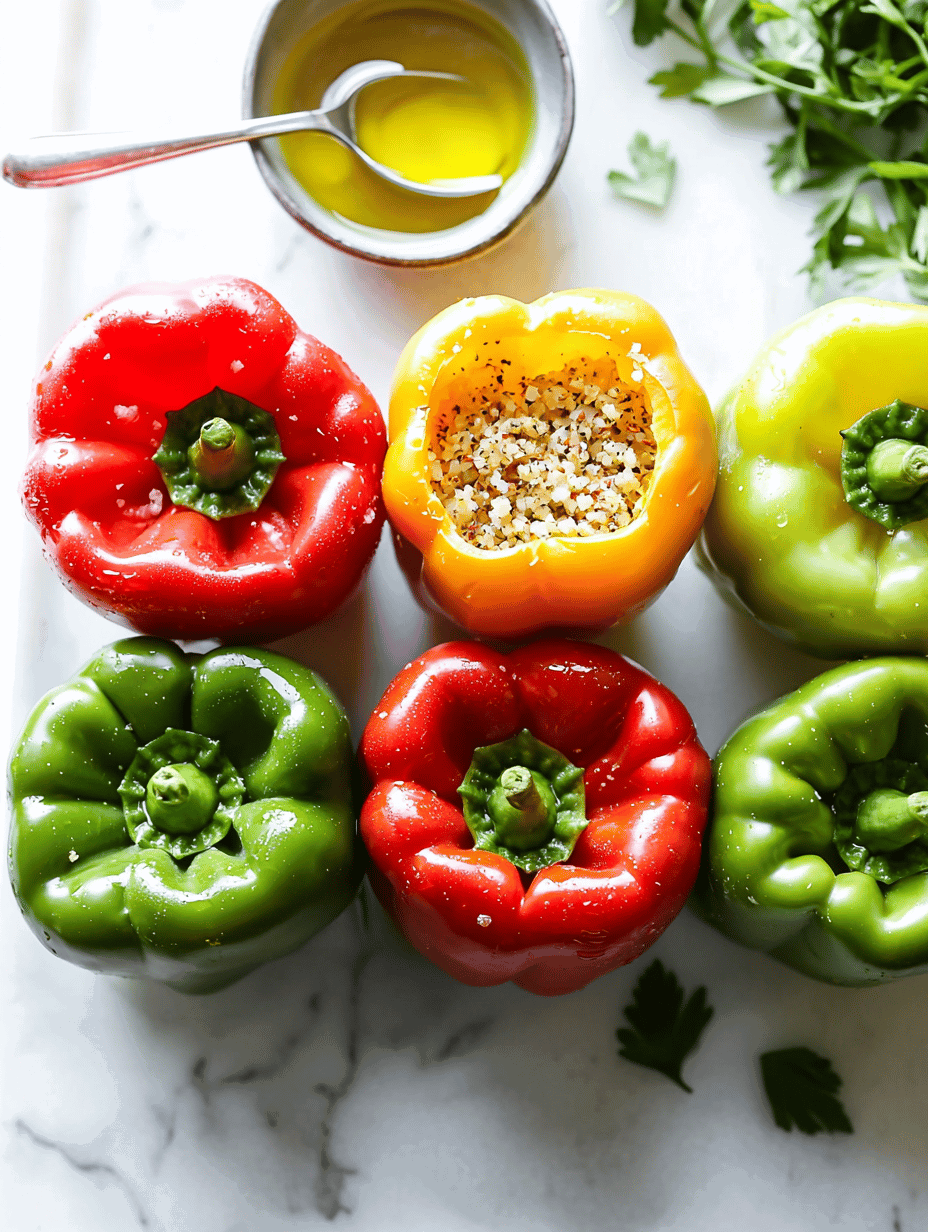 - Preheat your oven to 375°F (190°C). Cut the tops off the peppers and remove the seeds and membranes, then place them upright on a baking sheet. Drizzle lightly with a teaspoon of olive oil and set aside.