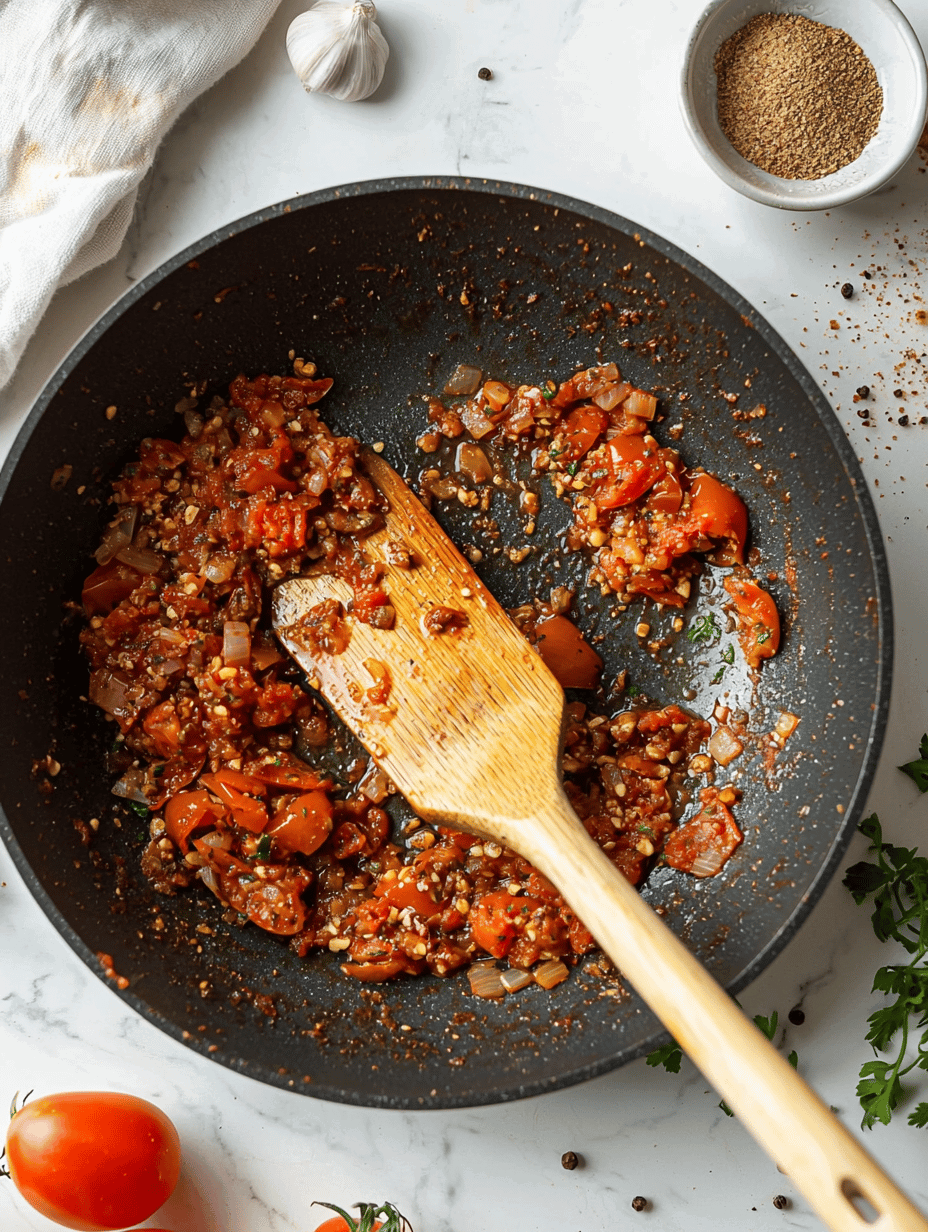 - Add the minced garlic, cinnamon, and cumin to the skillet, cooking for another minute until fragrant. Mix in the drained tomatoes and cook for a few minutes until heated through and slightly thickened.