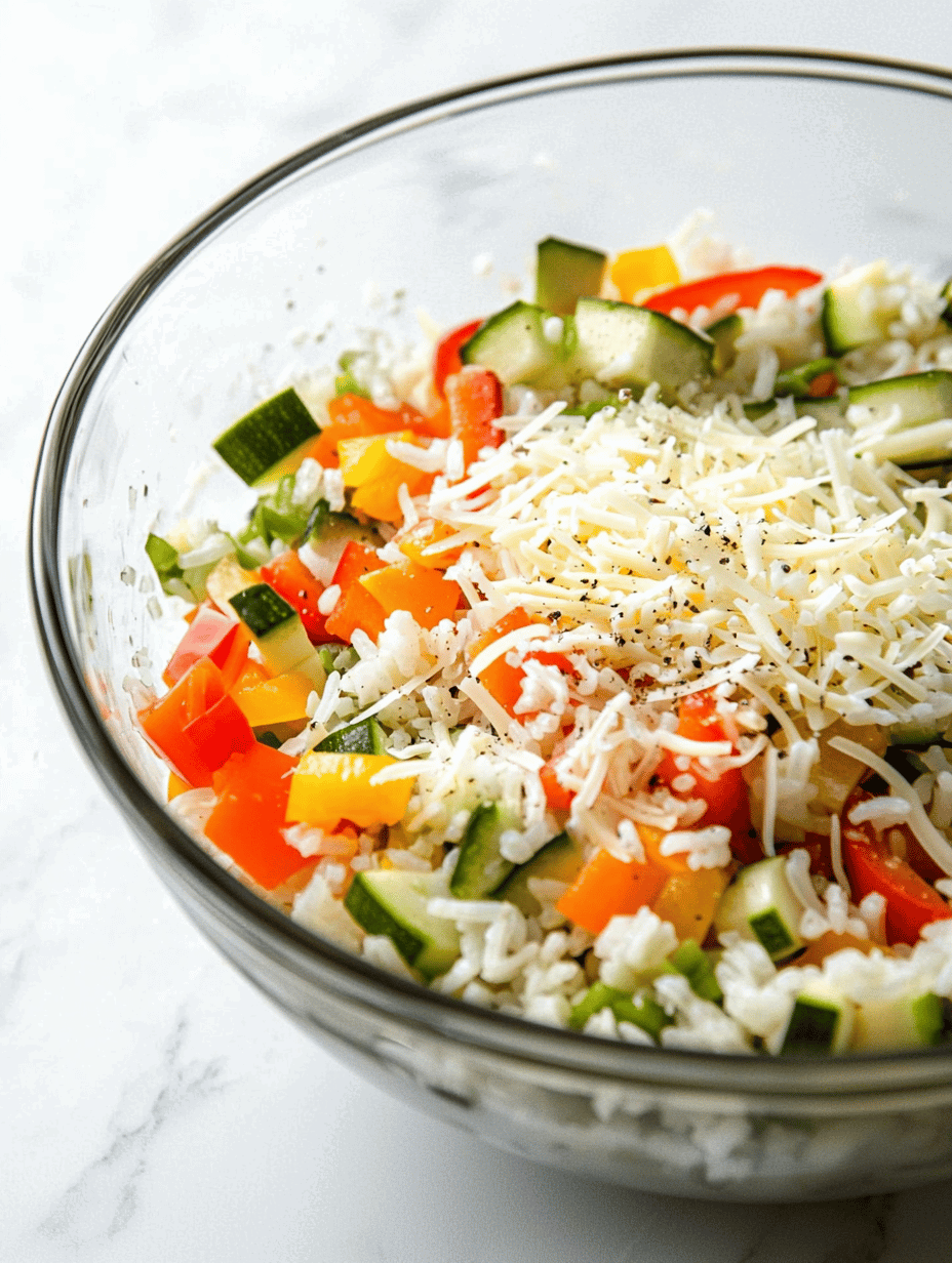 - Combine the cooked rice with the vegetable mixture in a mixing bowl. Stir in half of the shredded cheese, and season with salt and pepper to taste. Mix until evenly combined.