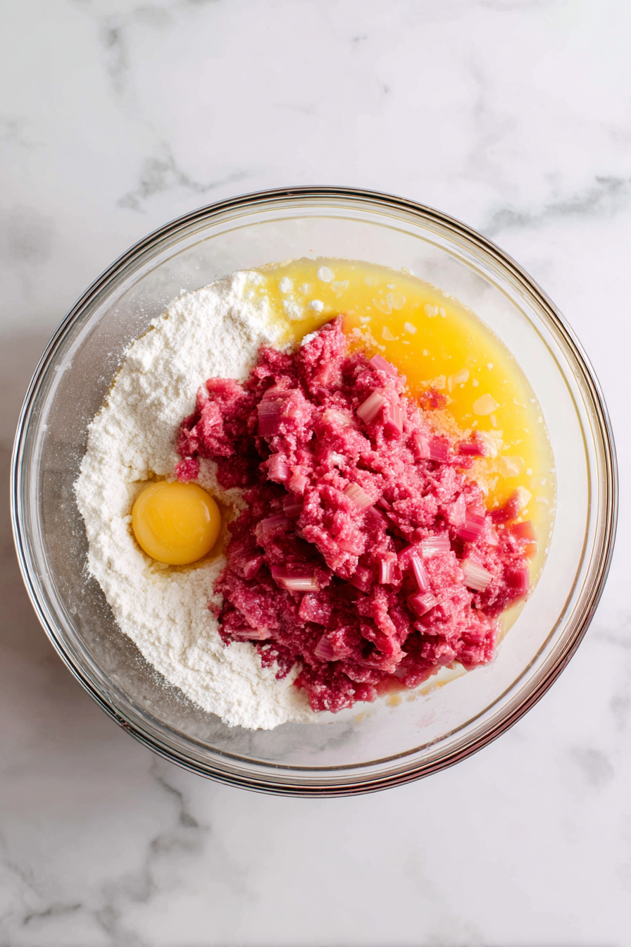 • In another bowl, whisk eggs, white sugar, salt, ½ cup flour, and chopped rhubarb until well combined.
