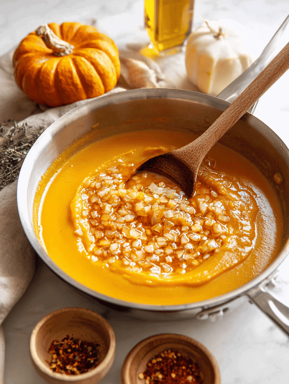 - Pour the pumpkin purée into the skillet with the sautéed onion and garlic. Warm through, stirring gently, until the sauce is heated and slightly thickened, about 2-3 minutes.