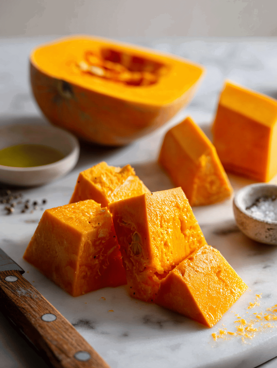 Step 2: Cut the pumpkin into rough 2-inch chunks, skin on—this keeps it rustic and flavorful.