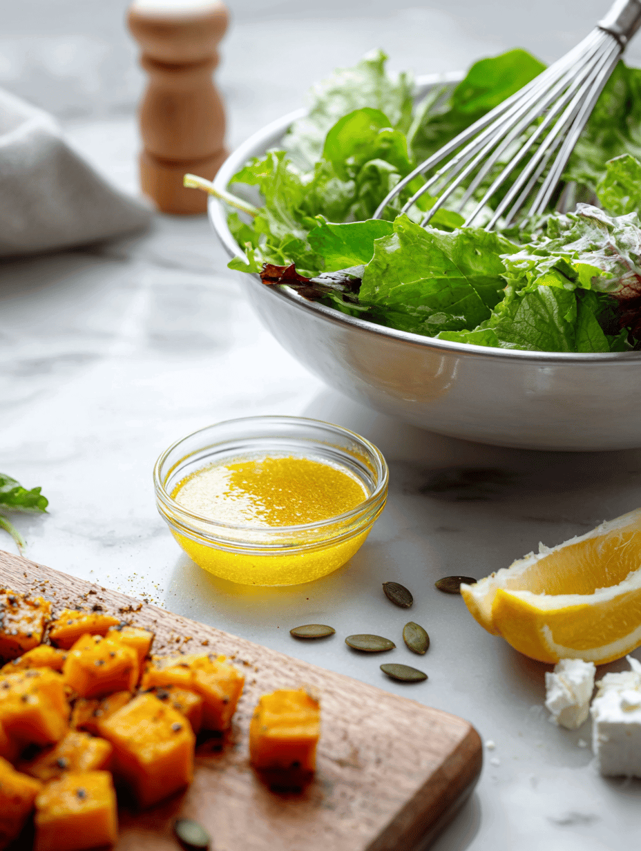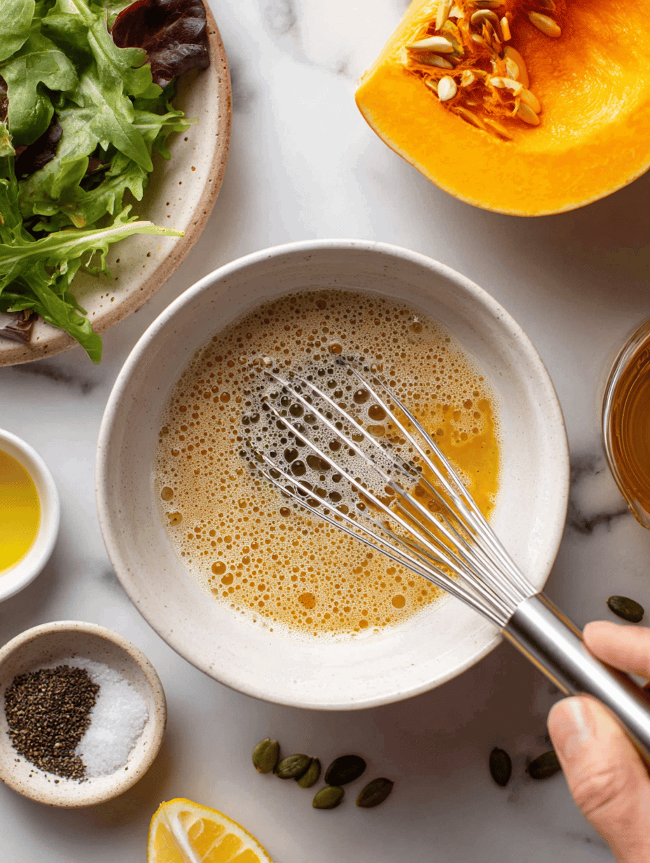 - Pour the dressing over the warm pumpkin and greens, then toss gently until everything is evenly coated.