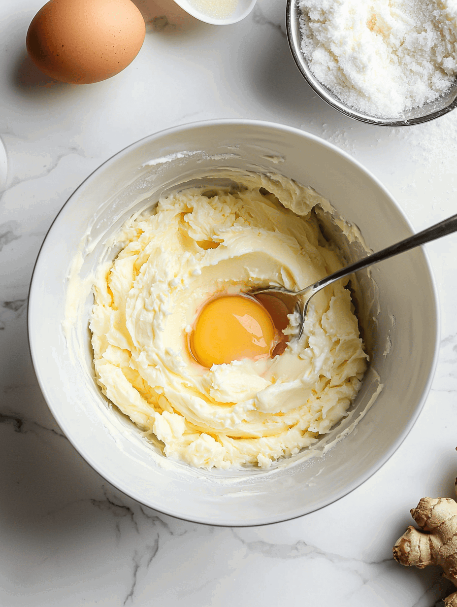 • Add the beaten egg and grated fresh ginger to the creamed mixture, blending thoroughly until combined. The batter will become slightly glossy and fragrant.