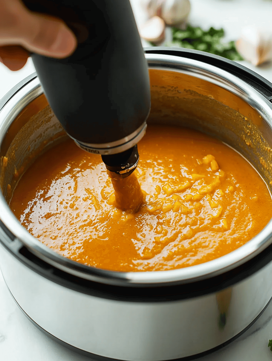 - Once the cooking time is up, use an immersion blender to blend the soup directly in the slow cooker until smooth and velvety, or carefully transfer to a blender in batches and blend until creamy.