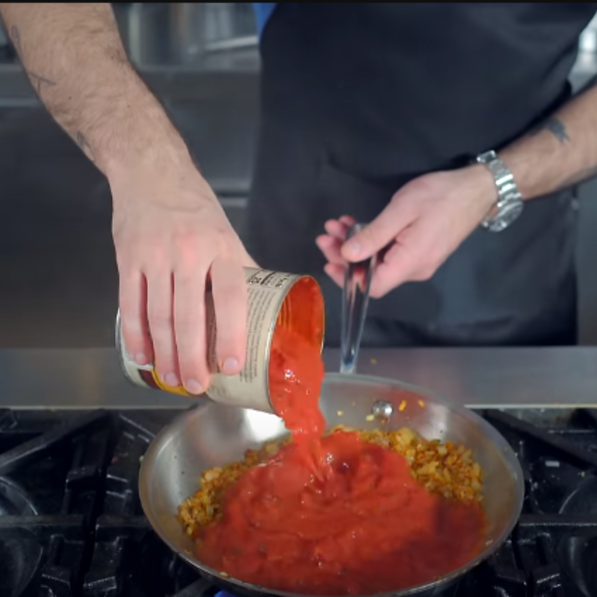 - Add minced garlic, ground cumin, smoked paprika, and chili flakes.Pour in the crushed tomatoes and season with salt and pepper. Stir well to combine.
