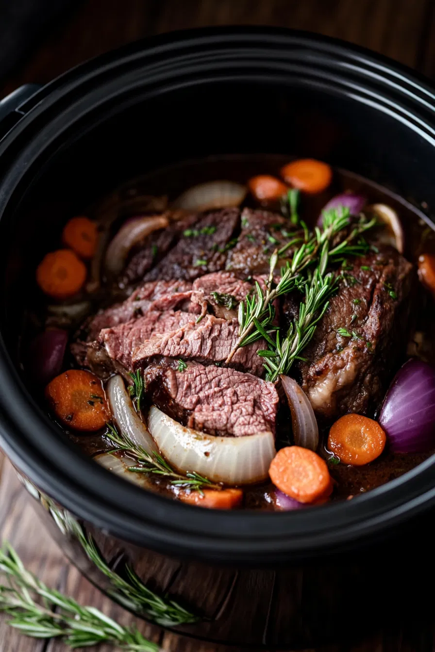 - Layer sliced onions and minced garlic at the bottom of the slow cooker, then pour in the red wine to deglaze and infuse the flavors as it begins to simmer.