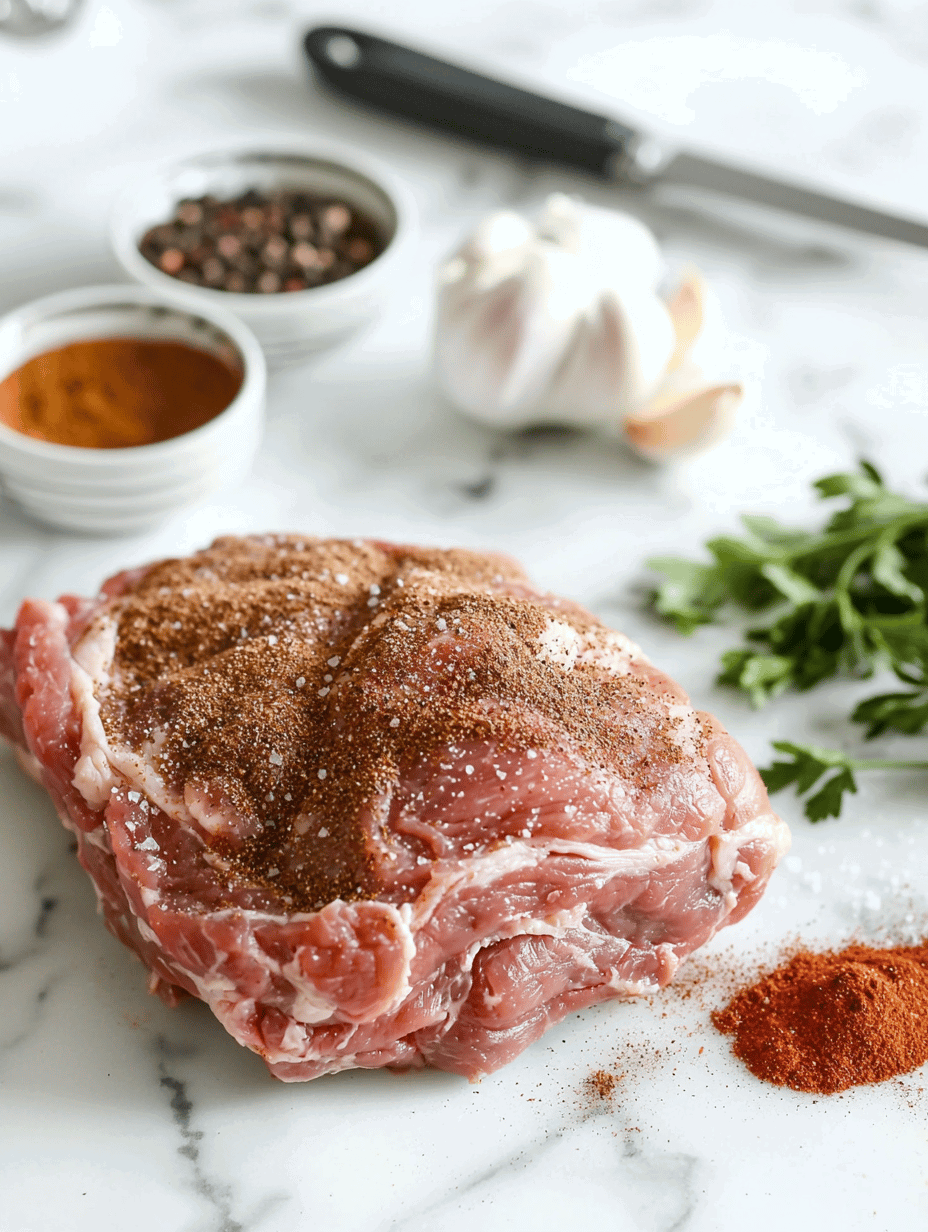 - Generously season the pork shoulder with salt, cumin, cinnamon, black pepper, and minced garlic, pressing the spices into the meat to coat evenly.