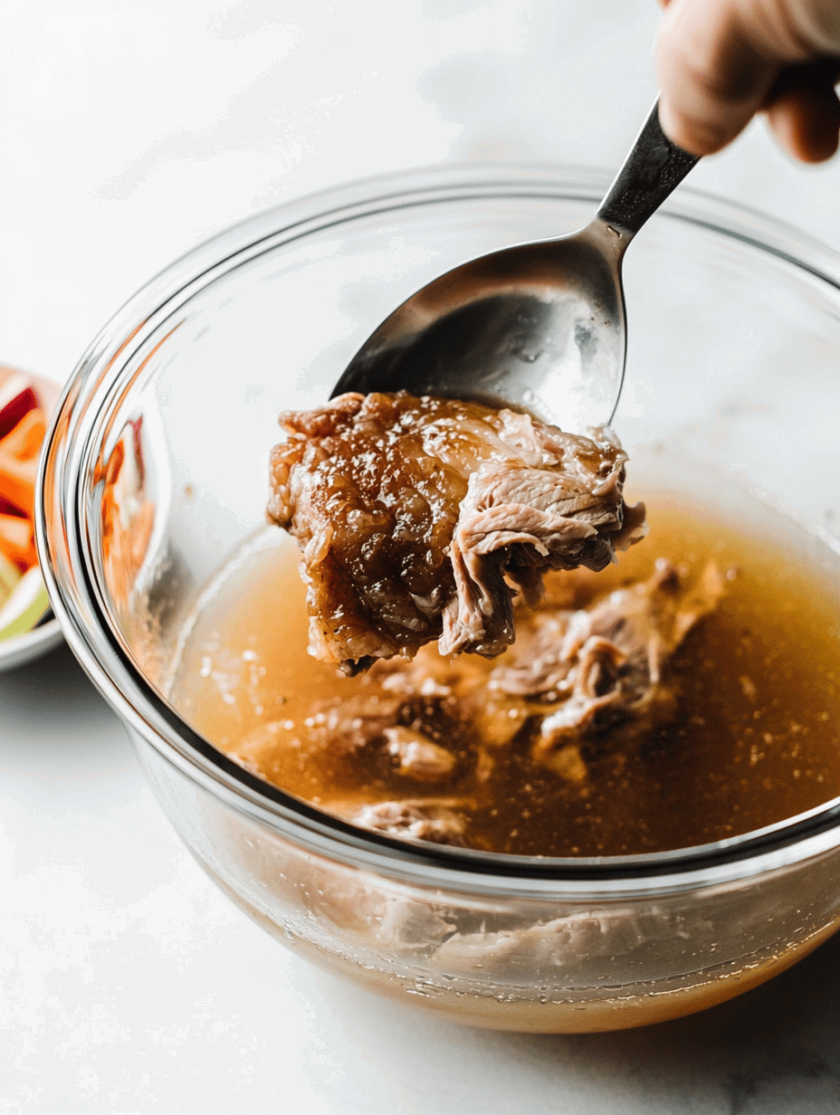 - When the pork is dry, splash in a bit of hot broth and stir gently.