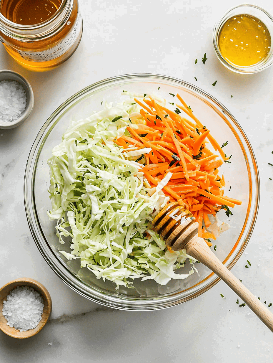 - While the pork cooks, prepare the slaw by tossing shredded cabbage and julienned carrots in a bowl with apple cider vinegar, honey, olive oil, and a pinch of salt. Mix well to combine and let sit to enhance flavors.