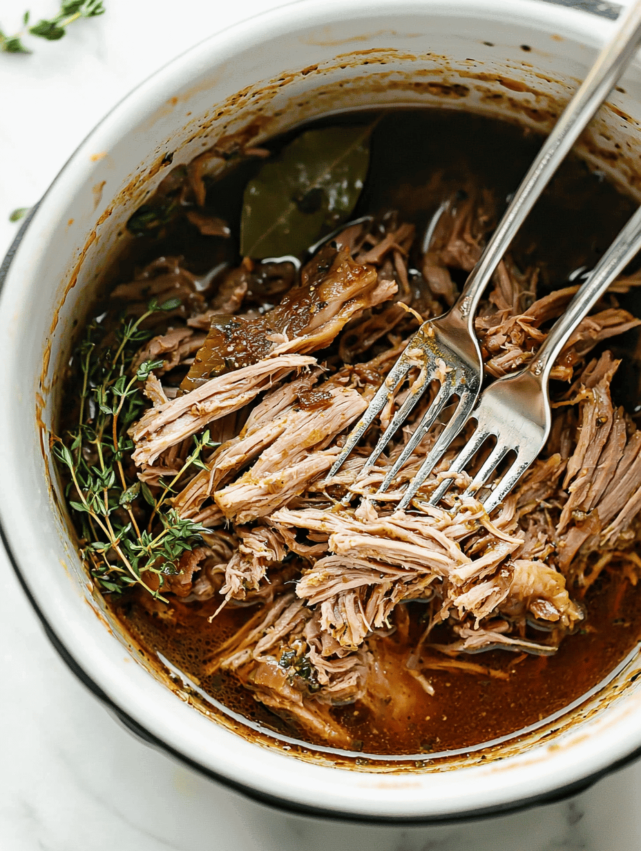 - Check the pork after cooking, and once tender, shred it with two forks directly in the slow cooker, mixing it with the flavorful juices.