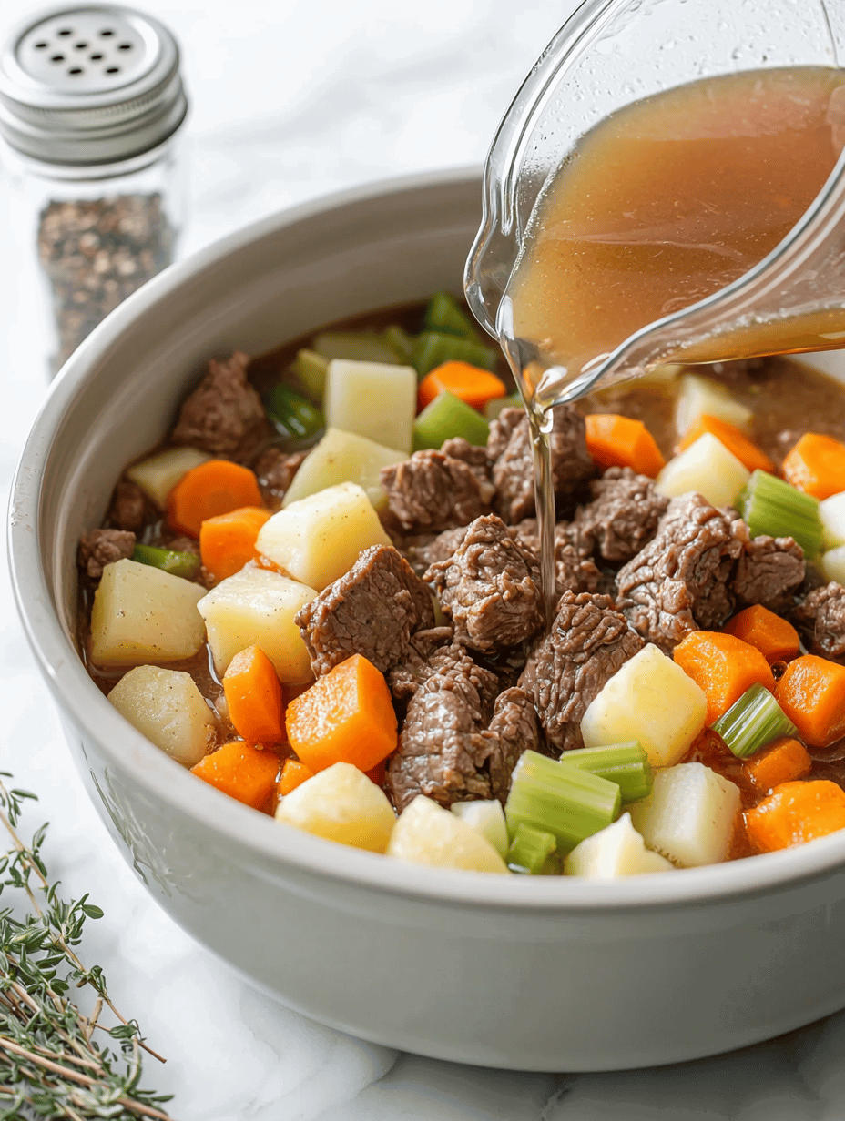 - Pour the beef broth over all the ingredients, ensuring the meat and vegetables are mostly submerged. Sprinkle in the dried thyme, add the bay leaf, then season with salt and pepper to taste.