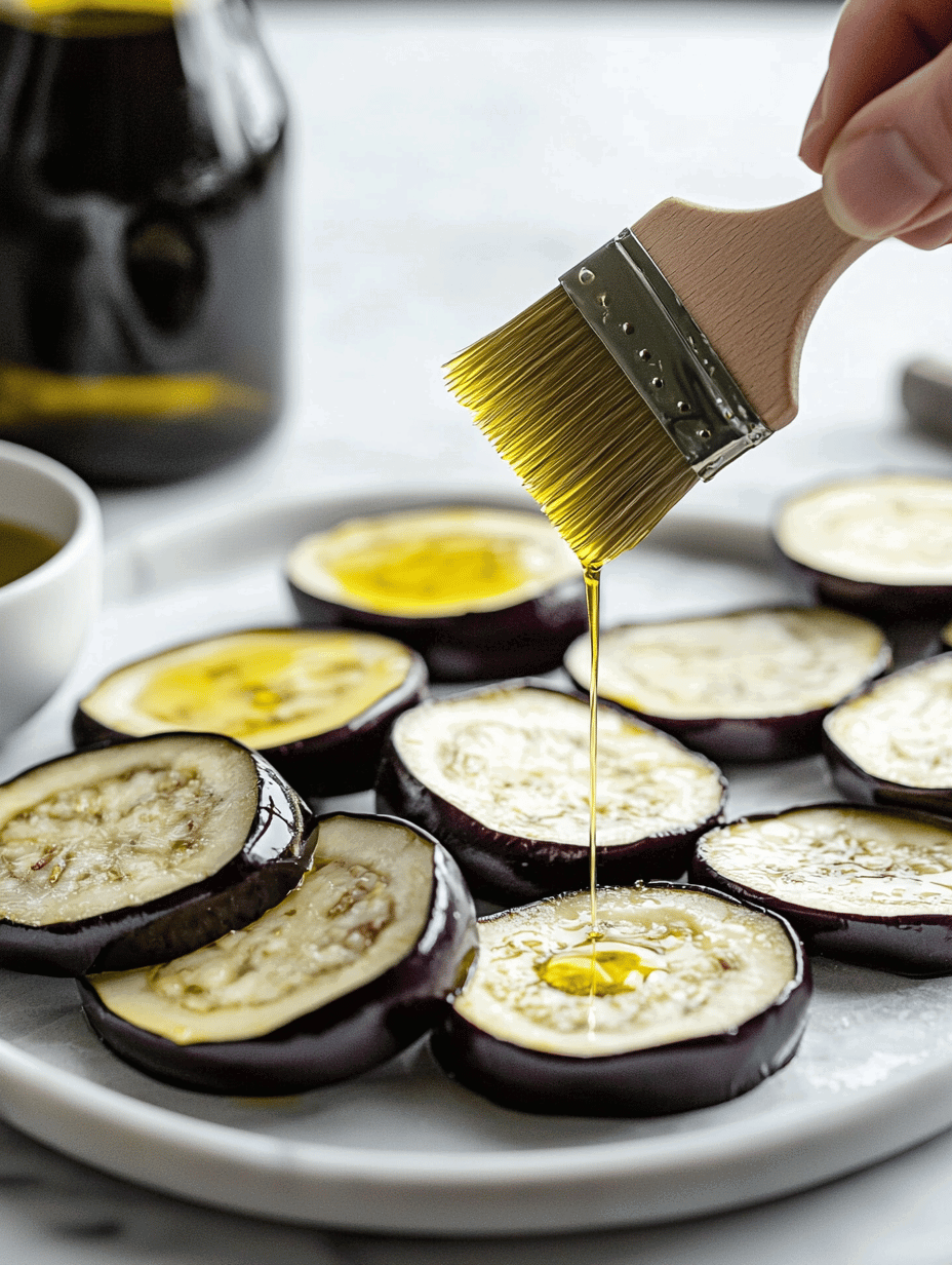 • Brush both sides of each eggplant slice with olive oil using a pastry brush. This helps them develop a golden, smoky crust as they roast.