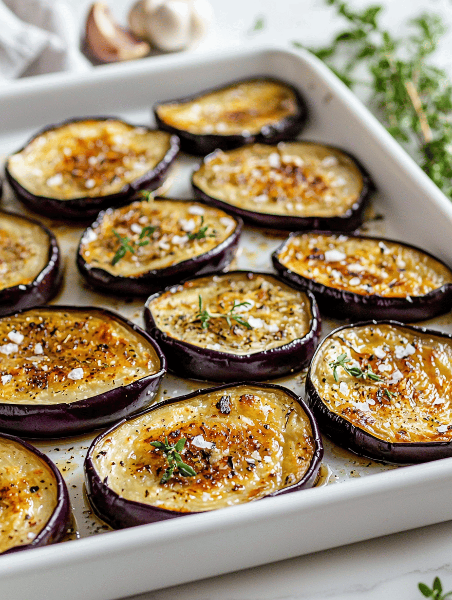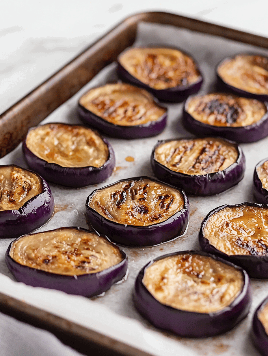 This dish involves roasting eggplant slices until they develop charred, smoky edges and a tender interior. The main ingredients are eggplant, olive oil, and seasonings, resulting in a dish with a soft, almost silky texture and rich, caramelized flavors. The final appearance showcases browned, slightly crispy edges with a deep, smoky aroma.