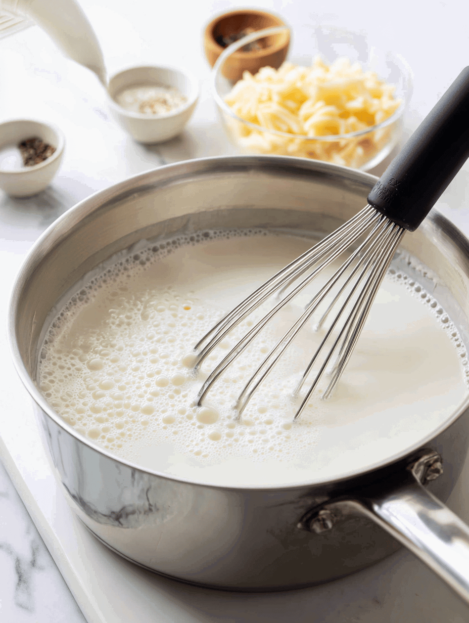 3. Gradually pour in milk or cream, whisking constantly. Heat until steaming but not boiling—about 10 minutes. You should see gentle bubbles and a silky sheen.