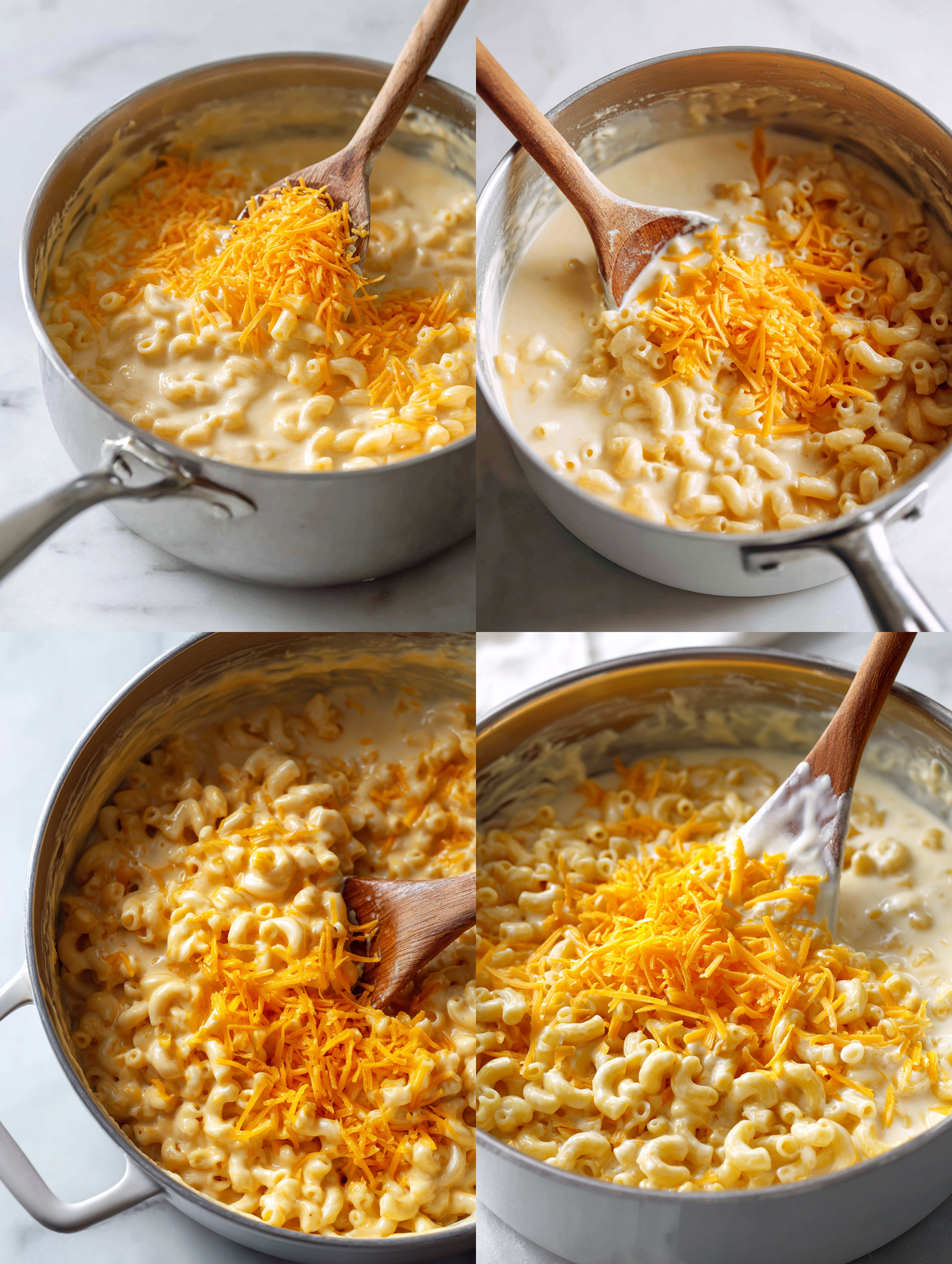 • Add the grated cheddar cheese in small handfuls, stirring continuously until each addition melts into a smooth, creamy sauce. The cheese should be gooey and silky.