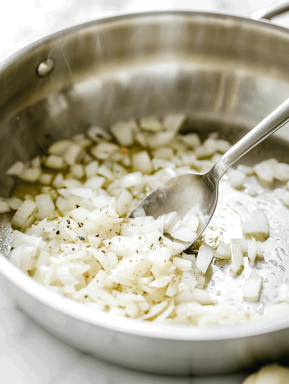 • Heat a large pot over medium heat and add the olive oil. Once shimmering, add the chopped onion and sauté until translucent and fragrant, about 5 minutes.