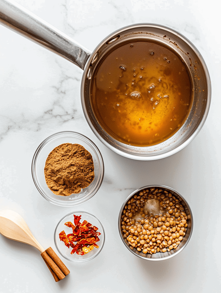 • Pour in the vegetable broth and add the rinsed lentils, then stir in the cumin, cinnamon, red pepper flakes, and a pinch of salt.