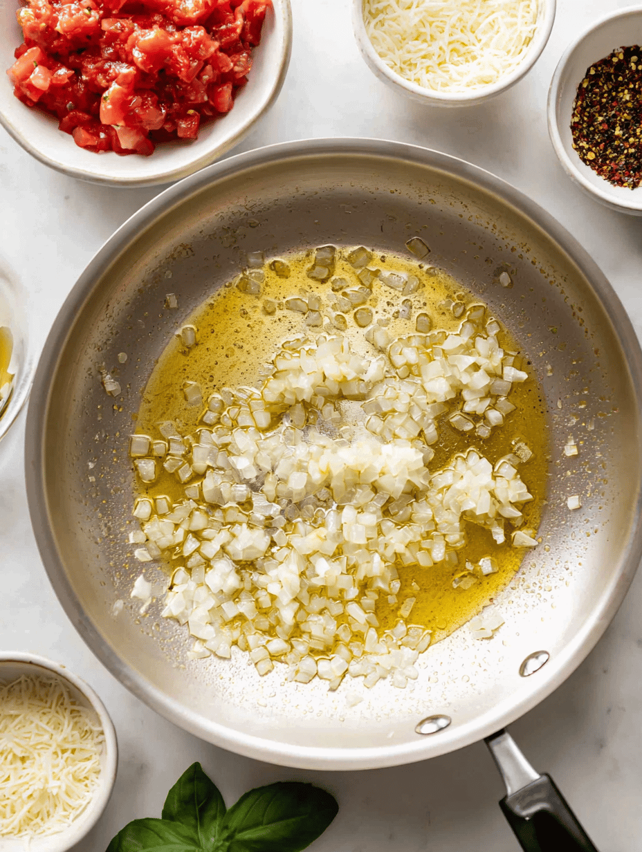 - In a skillet, heat olive oil over medium heat, then add chopped onion and minced garlic. Sauté for about 3 minutes until fragrant and the onion turns translucent.