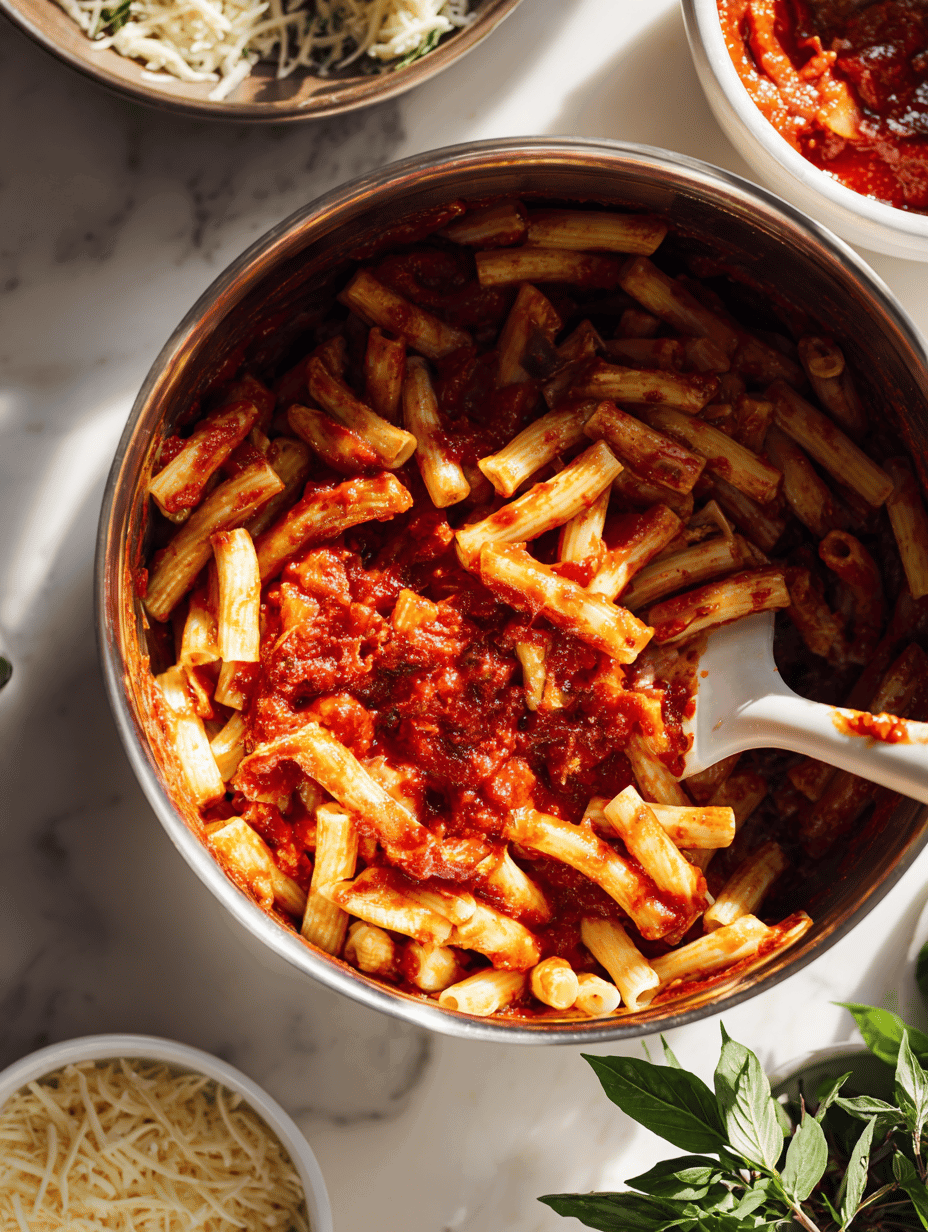 - Fold the cooked ziti into the sauce, ensuring each piece is coated evenly. Then transfer everything into your prepared baking dish.