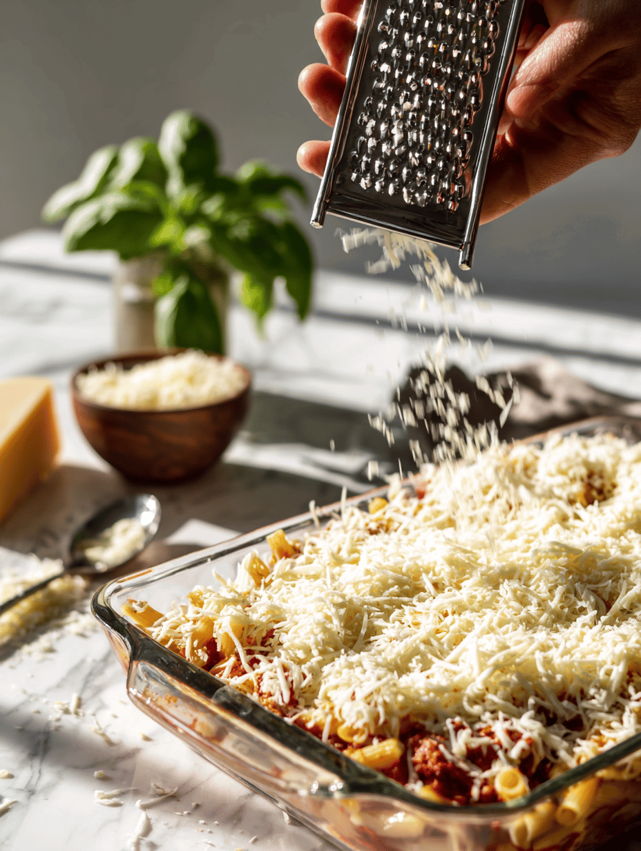 - Sprinkle a generous layer of shredded mozzarella over the top, followed by a sprinkle of grated Parmesan for extra flavor and a golden finish.
