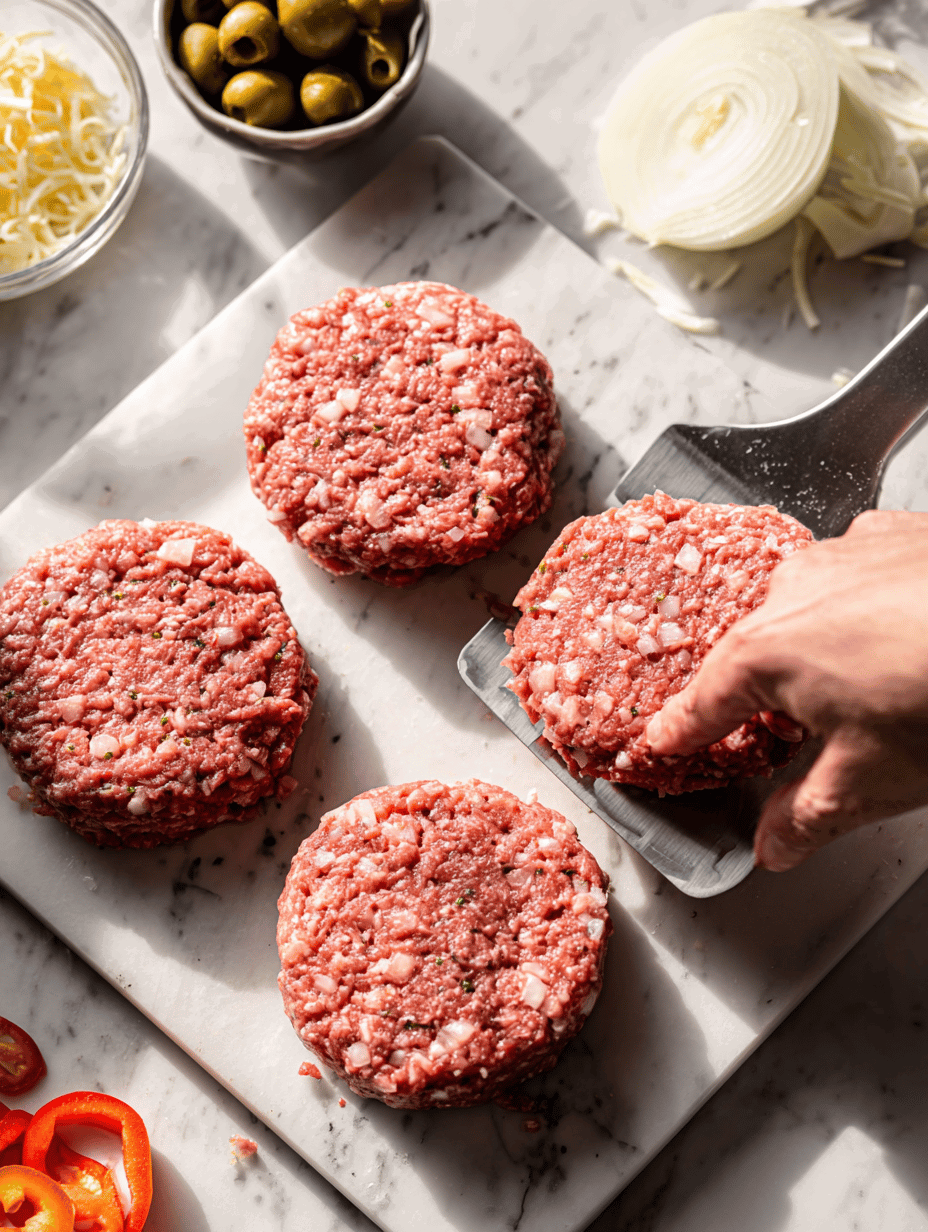 • Divide the ground beef into four equal portions and gently shape each into a slightly larger-than-bun round, pressing a small dimple in the center to prevent puffing up.