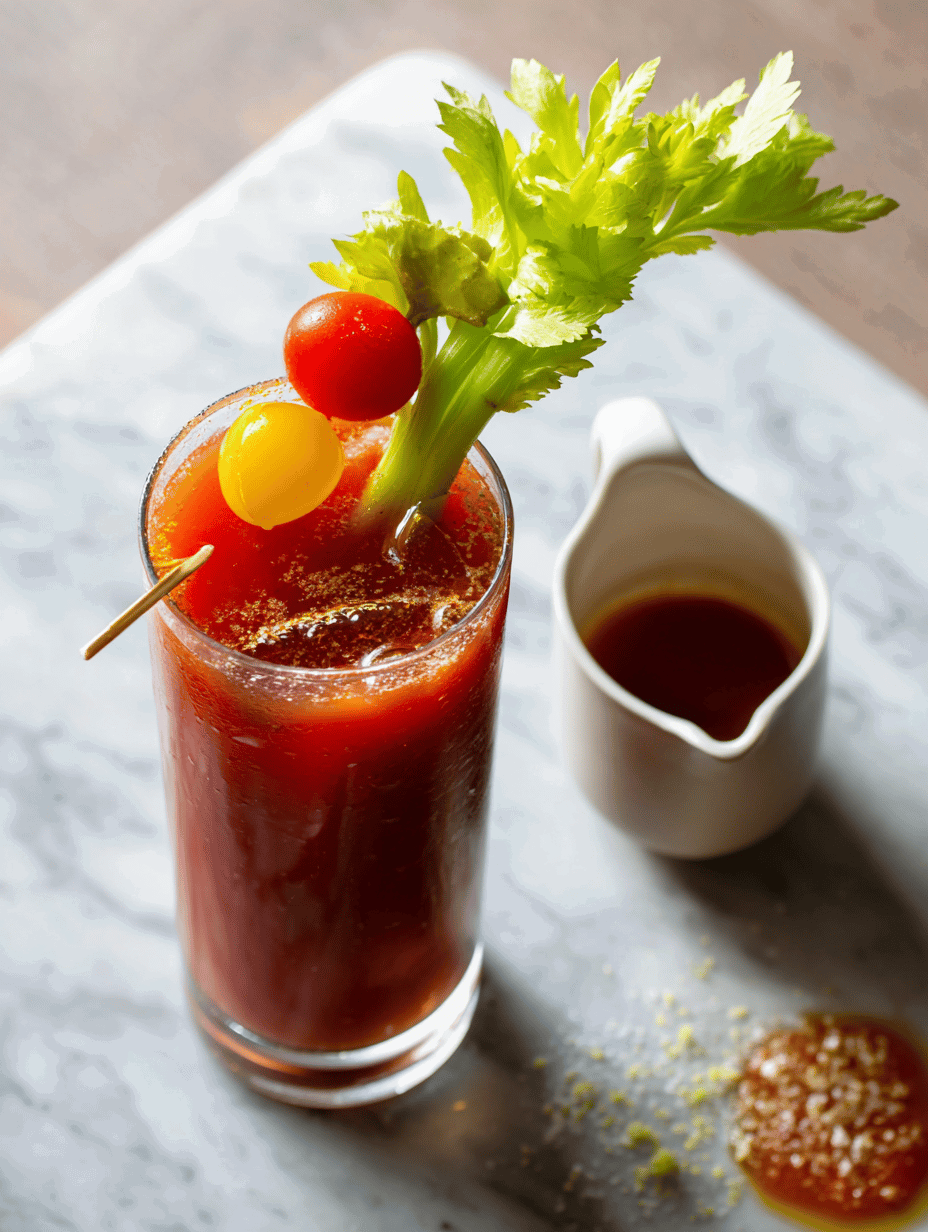 • Garnishes (celery, lemon, olives): Crunchy, tangy, and salty—visual and textural contrasts.
