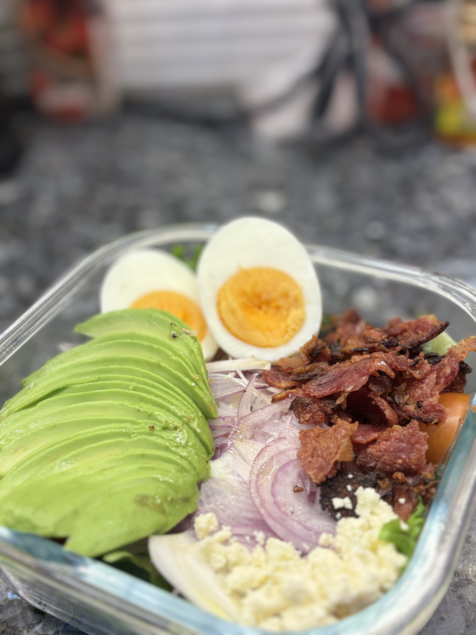 1. In a large bowl, layer greens, sliced cherry tomatoes, sliced onions, hard boiled eggs, and crumbled bacon.