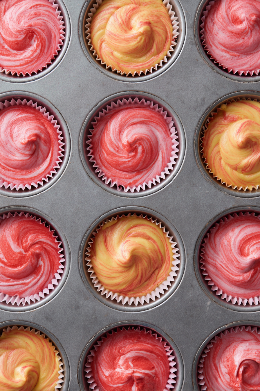 - Swirl pink and yellow frosting in a piping bag and frost cooled cupcakes.