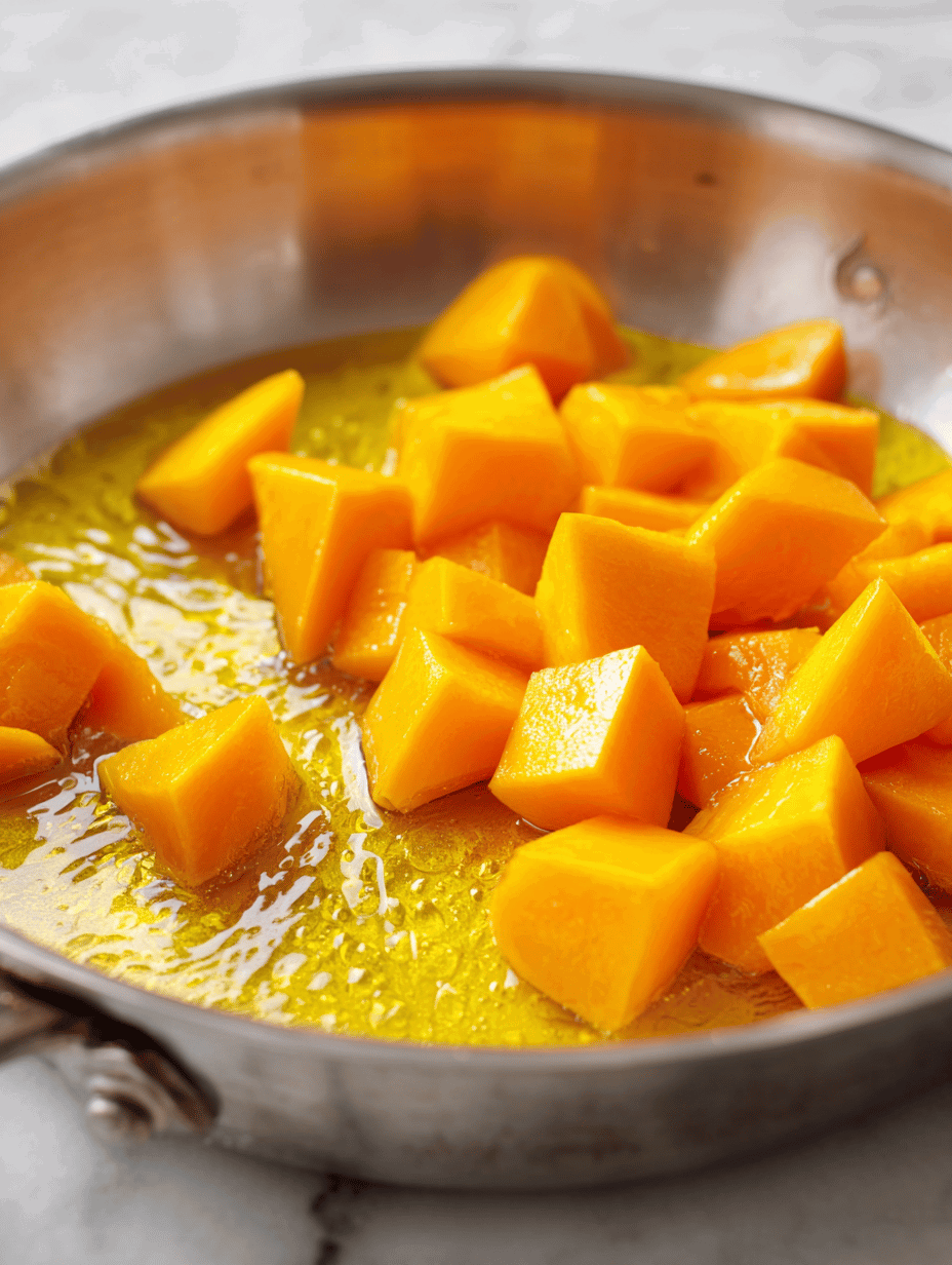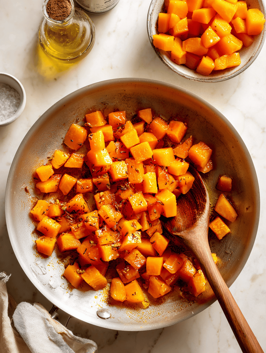 • Add the diced pumpkin to the pan, sprinkle with a pinch of salt, and cook, stirring occasionally, until the pumpkin starts to turn golden brown and develops a deep caramel color, about 10 minutes. You’ll notice a smoky aroma and the pumpkin softens slightly.