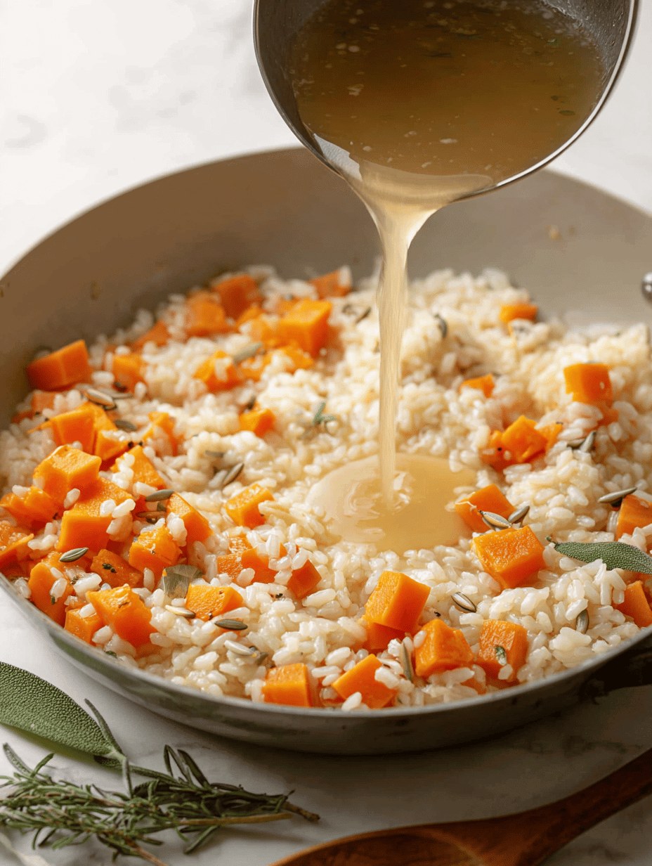 • Continue this process, stirring gently and adding broth gradually, until the rice is tender and creamy, about 20 minutes. The pumpkin should be deeply golden and fragrant, and the mixture should have a warm, amber hue with a silky texture.