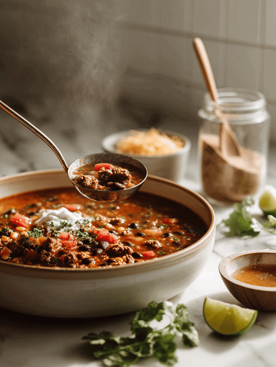 - Serve hot: Ladle into bowls, pile on cheese, sour cream, and cilantro. Squeeze lime over the top — that zesty brightness is everything.