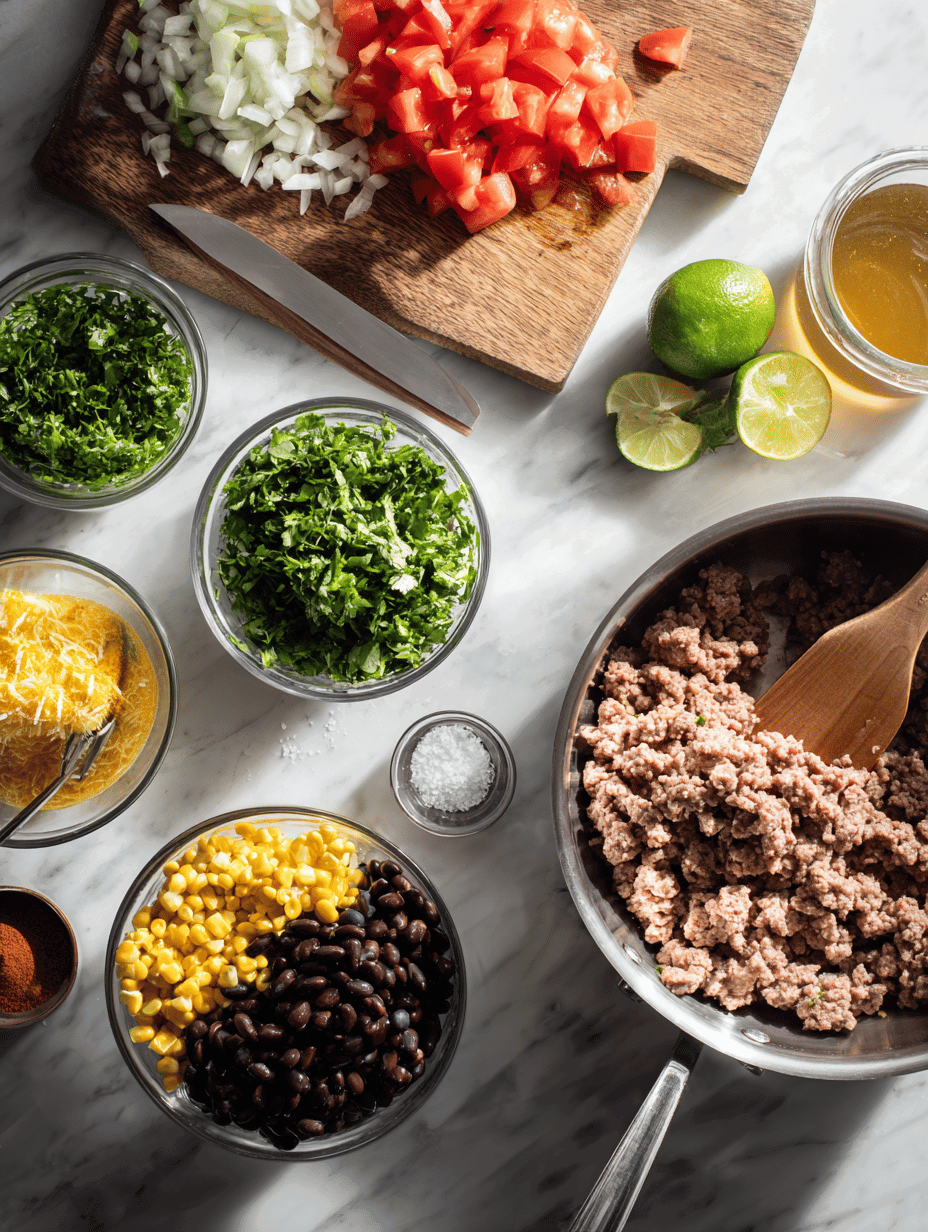 - Ground beef or turkey: I like the richness of beef, but turkey is leaner and milder.: Adds hearty protein and absorbs flavors well.