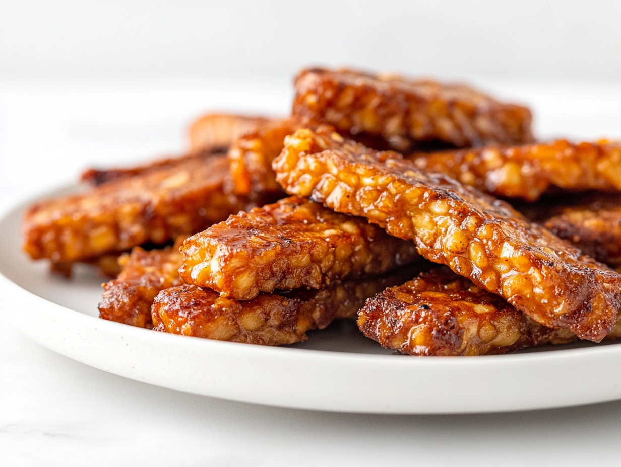 Tempeh is a tasty plant-based meat alternative from Indonesia, made from fermented soybeans. Imagine a cake made of soybeans! You usually find it in rectangular blocks or strips, and it comes either plain or pre-flavored.