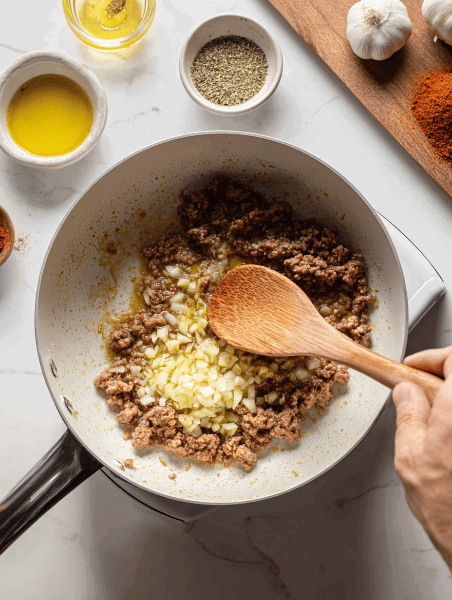 - Add ground beef. Break it apart with your spoon, stirring until browned and no longer pink—about 8-10 minutes. If it releases excess fat, drain some off, but keep enough to maintain flavor and richness.