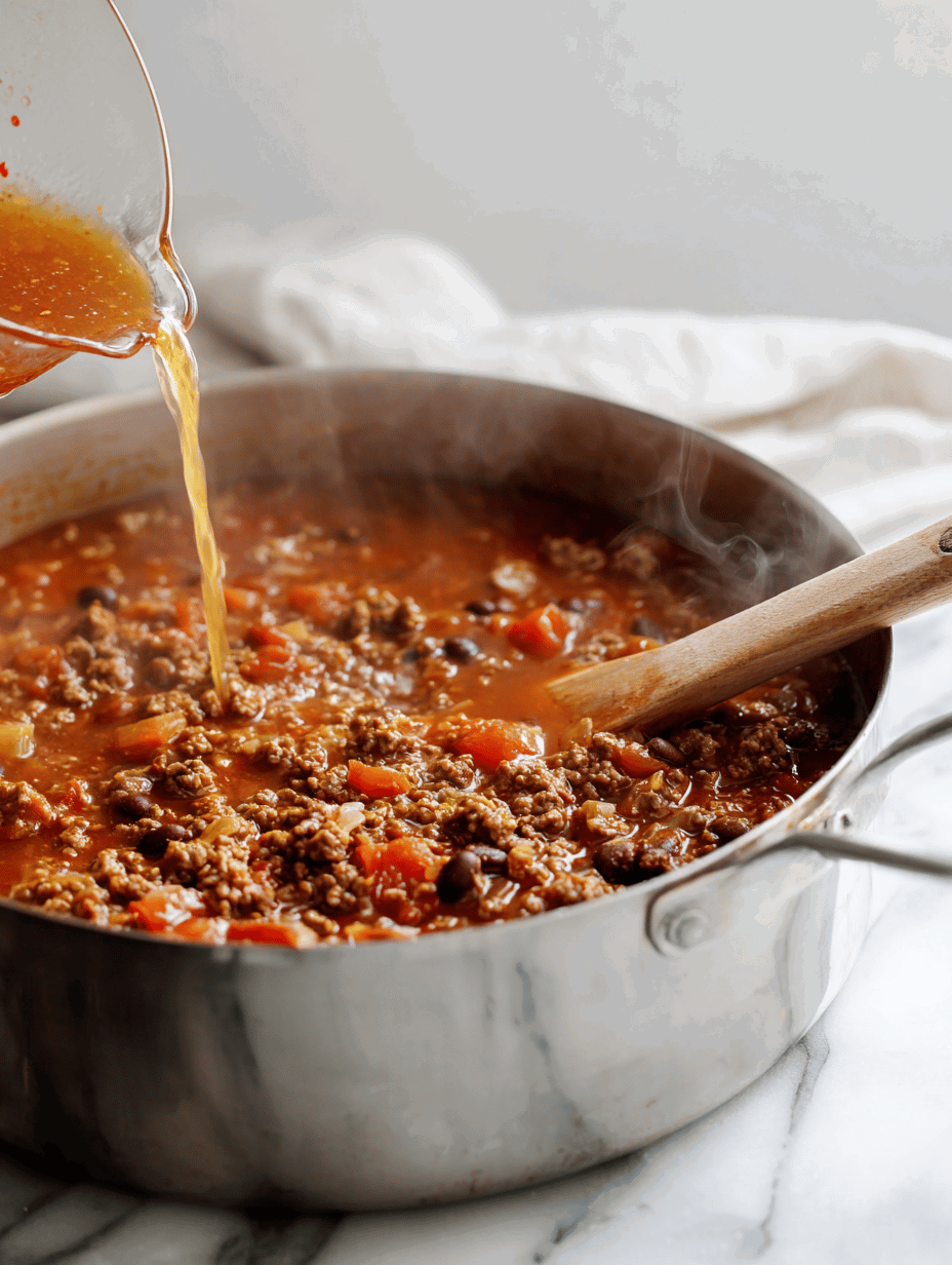 - Pour in the chopped tomatoes and beef broth, scraping the bottom of the pot to loosen any browned bits. Bring the mixture to a gentle simmer, then lower the heat to low, cover loosely, and simmer for 45 minutes, stirring occasionally, until the chili thickens and flavors meld.
