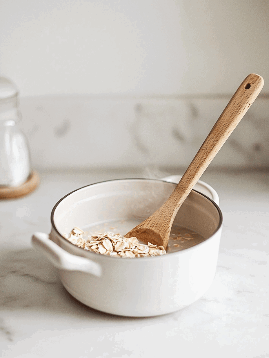 - Combine oats and water (or milk) in a saucepan and bring to a gentle boil over medium heat. Reduce heat to low and simmer, stirring occasionally, until the oats are soft and have absorbed most of the liquid, about 5-7 minutes.
