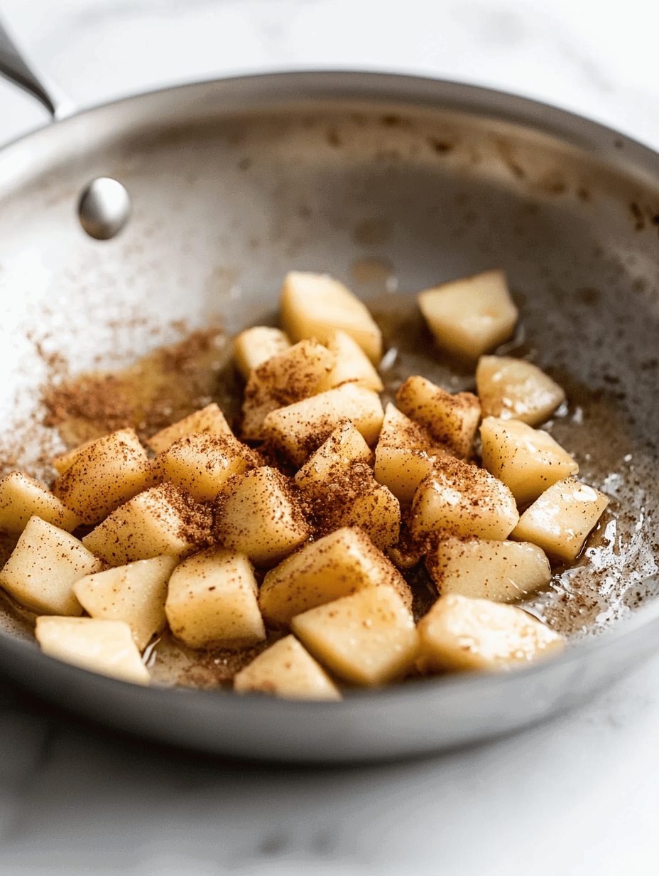 - Meanwhile, heat a small skillet over medium and melt the butter. Add the diced apple, sprinkle with cinnamon, and brown sugar. Sauté, stirring frequently, until the apples are tender and caramelized with a fragrant aroma, about 4-5 minutes.