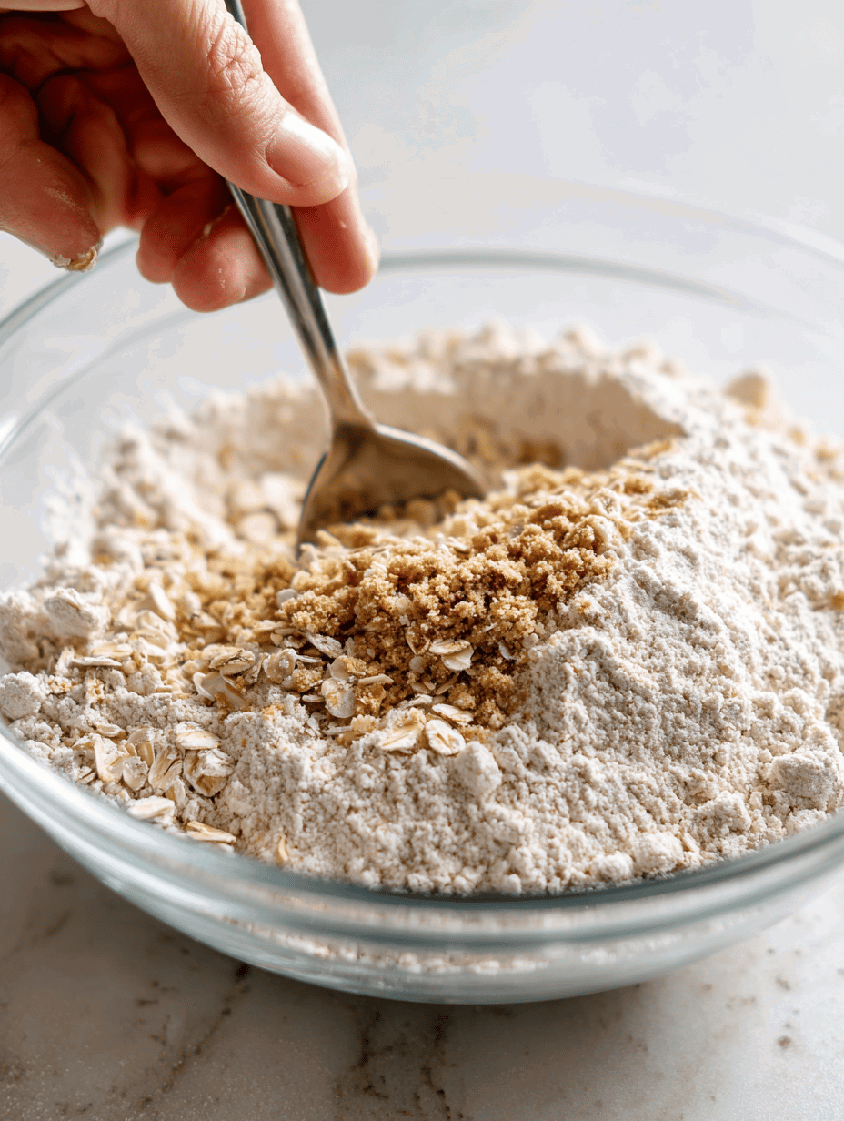 • In a mixing bowl, combine the flour, oats, brown sugar, and a pinch of salt. Mix them together until evenly distributed, creating the base for your crumble topping.
