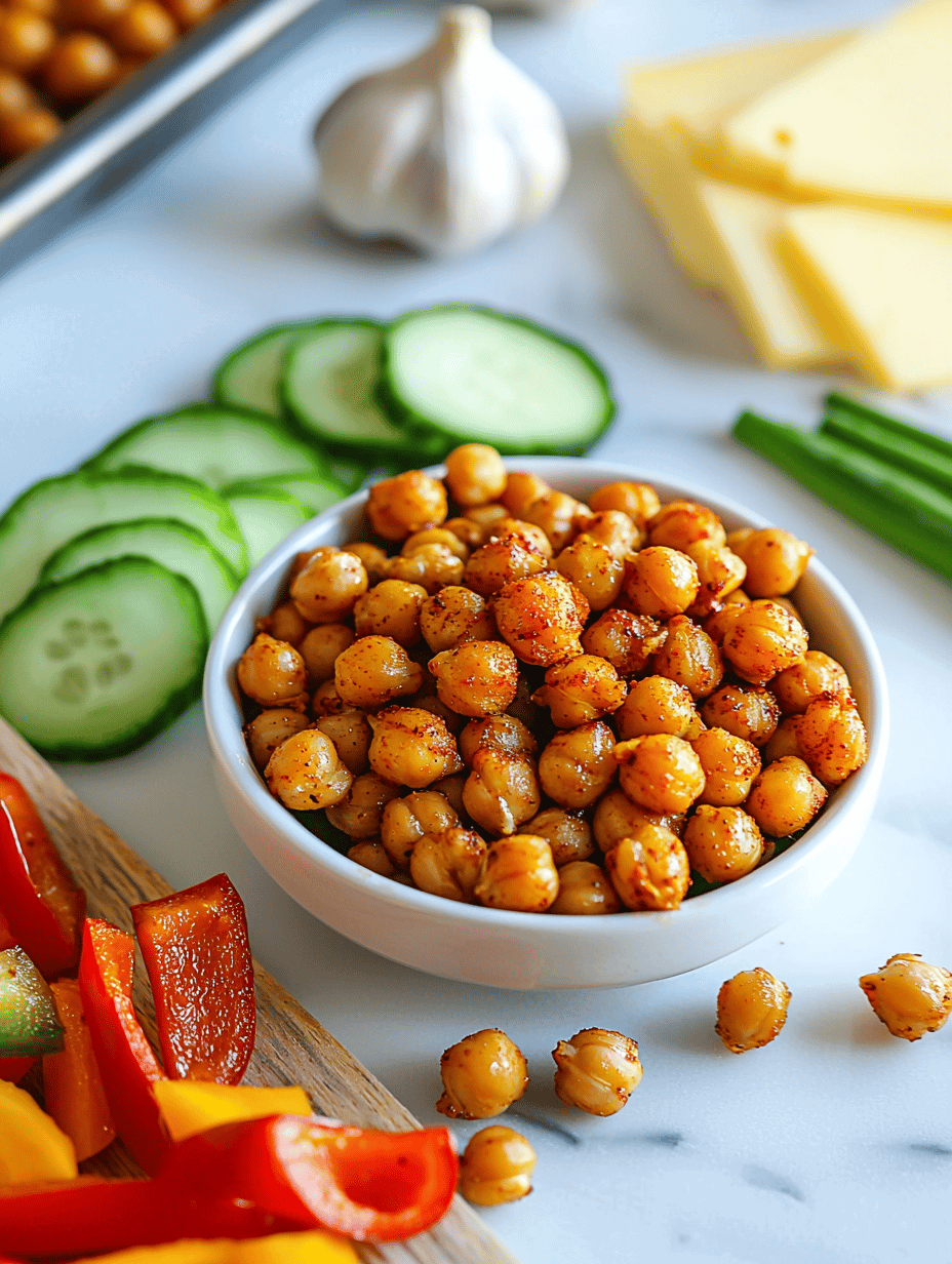 • Once the chickpeas are crispy and fragrant, remove them from the oven and let them cool slightly. Then, scatter the crunchy chickpeas over the cheese and vegetable arrangement to add texture and smoky flavor.